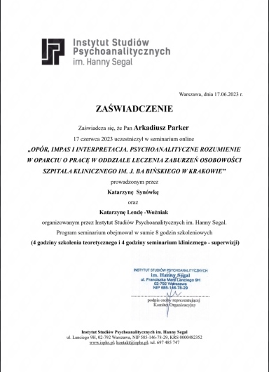 Jestem członkiem Polskiego Towarzystwa Psychologicznego, Polskiego Towarzystwa Psychiatrycznego oraz Polskiego Towarzystwa na rzecz Psychologicznego i Społecznego Podejścia do Psychoz. Pracuję zgodnie z kodeksem etycznym PTP.