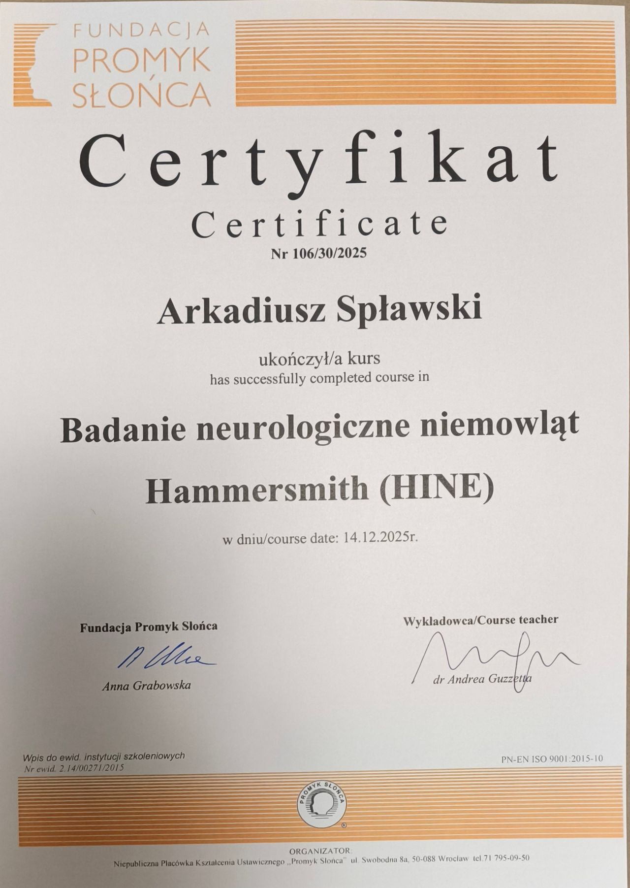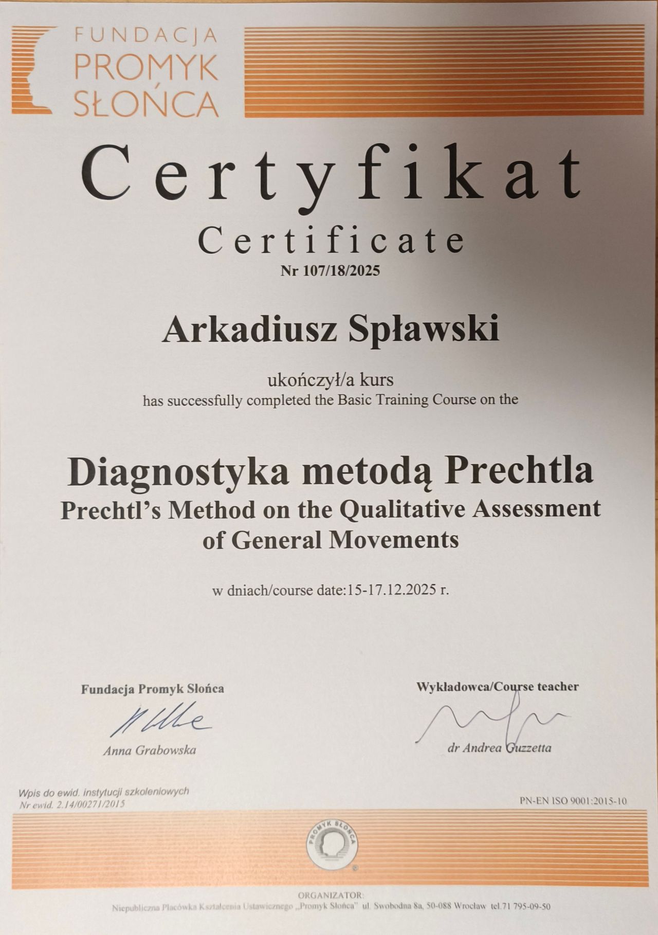 Dzień dobry. Jestem fizjoterapeutą dziecięcym specjalizującym się w terapii niemowląt i dzieci z opóźnieniami rozwojowymi oraz zaburzeniami neurologicznymi. W swojej pracy kładę nacisk na wspieranie rozwoju dziecka w jak najbardziej komfortowych dla niego warunkach, jego indywidualnych potrzeb oraz na współpracy z rodzicami i budowaniu relacji między nimi, a dzieckiem. Swoją pracę z dziećmi rozpoczynałem w Ortopedyczno-Rehabilitacyjnym Szpitalu Klinicznym im. Wiktora Degi w Poznaniu, gdzie pracuję do dziś. Mam tam możliwość obserwacji pacjentów z różnymi dysfunkcjami i ich rodzin w codziennym funkcjonowaniu. Moją misją jest aby jak najlepiej wspomóc Państwa codzienność oraz przyszłość. Regularnie poszerzam swoją wiedzę na kursach i szkoleniach, aby zapewnić Państwu jak najlepszą opiekę.