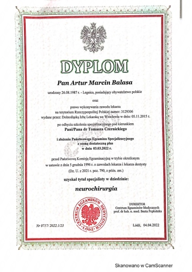 Człowiek z powołaniem profesjonalne podejście do pacjenta i problemu wszystko dokładnie wyjaśnił i przedstawił proces leczenia, ma czas dla pacjenta nie lekceważy pytań tylko dokładnie i świadomie odpowiada . Operacja bez żadnych problemów wszystko sprawnie i profesjonalnie oczekiwania po operacji lepsze niż zakładałem . Polecam Neuro Eksperci Warszawa oraz Wojewódzki szpital oddział neurochirurgii w Płocku - dr n. med Artur BALASA