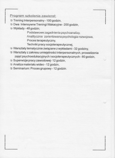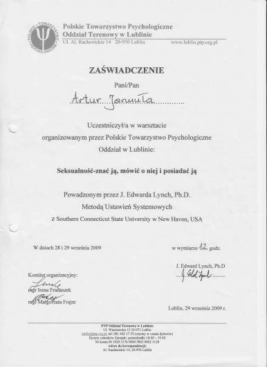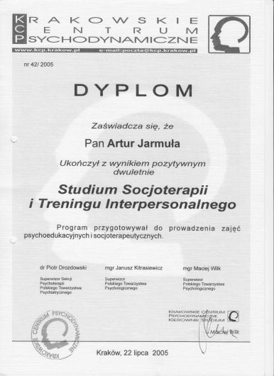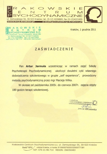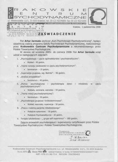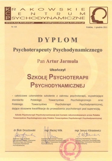 Ukończyłem czteroletnią Szkołę Psychoterapii Psychodynamicznej w Krakowskim Centrum Psychodynamiczym (szkoła i kurs rekomendowana przez PTP). Ponieważ zdecydowanie jest mi bliższa koncepcja kształcenia psychoterapeuty oparta o konsekwentne i systematyczne doskonalenie się w jednym określonym nurcie ciągle jestem związany z krakowskim środowiskiem psychodynamicznym co pozwala mi kontynuować swoją edukacje po przez udział w kolejnych szkoleniach, konferencjach oraz superwizjach. Za kolejny fundament mojej pracy psychoterapeutycznej uważam prace w zespole co pozwala na ciągłe doskonalenie stosowanej przeze mnie metody oraz umożliwia poddanie własnej pracy weryfikacji przez innych psychoterapeutów. Jestem członkiem Polskiego Towarzystwa Psychoterapii Psychodynamicznej.