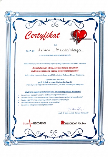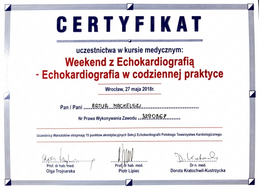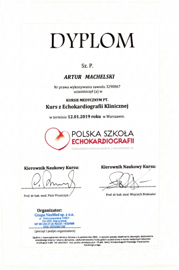 Uratowanie życia jest chyba najlepszą rekomendacją. Pan doktor po wykonaniu USG serca i diagnozie: rozwarstwienie aorty - natychmiast wezwał pogotowie ratunkowe dzięki czemu dobę później przeszedłem pomyślnie ciężką operację usunięcia tętniaka. Moja wdzięczność i mojej rodziny nie ma końca. Jest to kompetentny, empatyczny lekarz. Dziękuję!