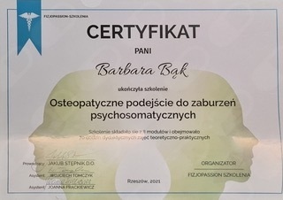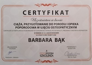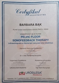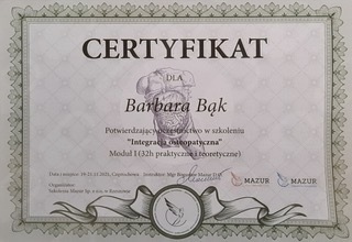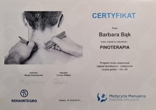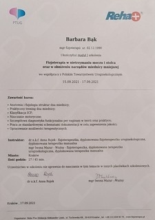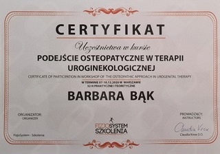 Uczestniczyłam w wielu szkoleniach z zakresu terapii uroginekologicznej , terapii kobiet w ciąży, terapii manualnej kręgosłupa, stawów obwodowych oraz narządów wewnętrznych. W terapii zwracam uwagę na mnogość połączeń i powiązań pomiędzy wieloma układami ludzkiego organizmu.