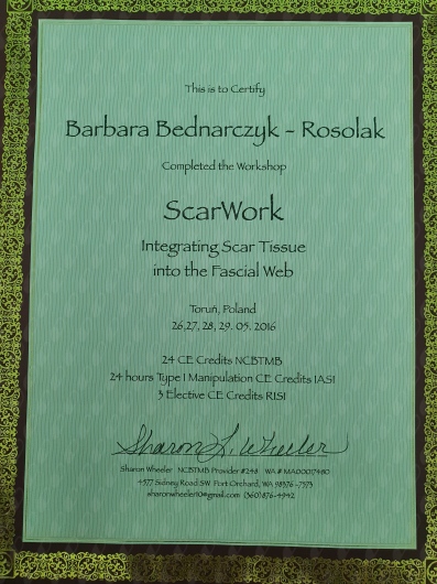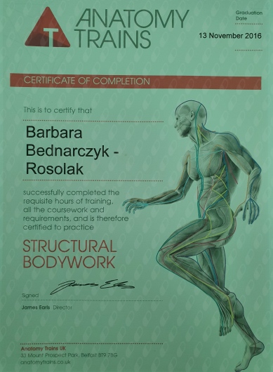 Pracuję głównie manualnie technikami mięśniowo-powięziowymi. Zwchwyt powiezią i efektami pracą z nią, doprowadził mnie do uzyskania tytułu Terapeuty Integracji Strukturalnej. Było to moje marzenie, które udało się spełnić. Wiedza anatomiczna taśm mięśniowo-powięziowych daje mi możliwość pracy w zasadzie z każdym problemem z ciałem. Podstawa mojej pracy to zrozumienie problemu i działanie przyczynowe.