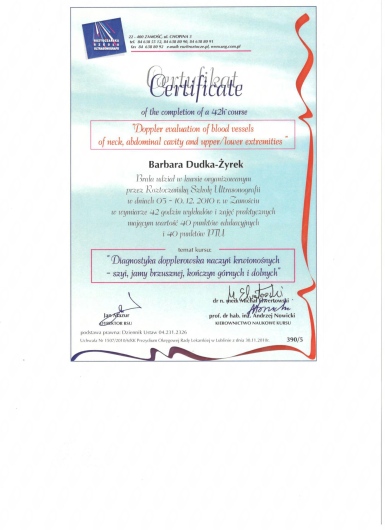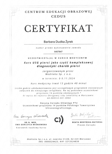 Jaki jest zakres porad oferowanych przez Barbara Dudka-Żyrek?Barbara Dudka-Żyrek to radiolog, lekarz wykonujący zabiegi medycyny estetycznej, ultrasonografista. Na podstawie swojego doświadczenia i wykształcenia Barbara Dudka-Żyrek oferuje usługi takie jak: USG piersi, USG jamy brzusznej, USG tarczycy, USG przezciemiączkowe, USG węzłów chłonnych, USG ślinianek, USG szyi, USG opłucnej, USG / doppler tętnic szyjnych, USG tkanek miękkich.