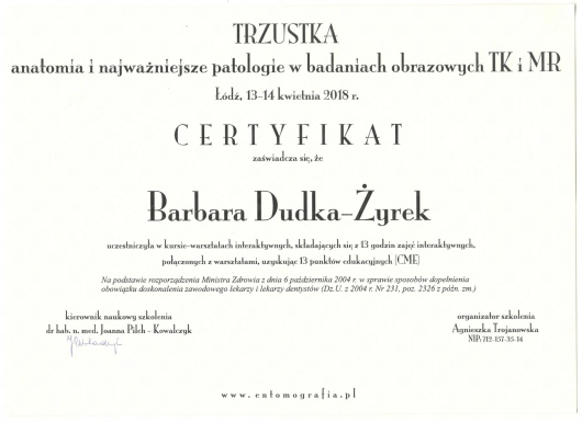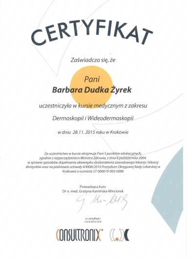 Jak Barbara Dudka-Żyrek umawia wizyty?Barbara Dudka-Żyrek używa kalendarza ZnanyLekarz, dlatego na stronie widzisz aktualne terminy. Wystarczy, że wybierzesz datę i godzinę, które odpowiadają Ci najbardziej. Umawianie wizyty jest darmowe, a tuż przed terminem wyślemy Ci przypomnienie.