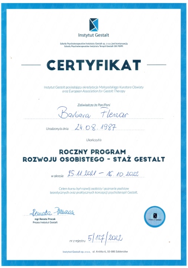 Jestem psychoterapeutką w trakcie szkolenia w Gestalt Instytut posiadającym akredytację Europejskiego Stowarzyszenia Psychoterapii Gestalt (EAGT) oraz Europejskiego Stowarzyszenia Psychoterapii (EAP).