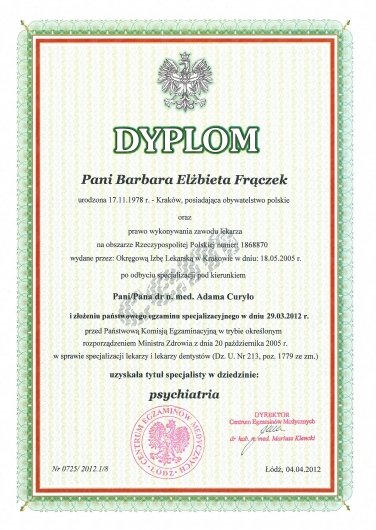 Miałam dziś swoją pierwszą wizytę u Pani doktor Barbary Frączek i jestem pod ogromnym wrażeniem. Pani Doktor poświęciła mi naprawdę dużo czasu, dokładnie przeanalizowała mój stan zdrowia i bardzo uważnie mnie wysłuchała. Nigdy wcześniej nie doświadczyłam tak empatycznego, spokojnego i rzetelnego podejścia ze strony psychiatry. Czułam się w pełni zaopiekowana, zrozumiana i potraktowana z szacunkiem. Zostało mi zalecone leczenie, które szczegółowo omówiłyśmy. Serdecznie polecam Panią doktor każdemu, kto szuka profesjonalnej, ciepłej i zaangażowanej pomocy.