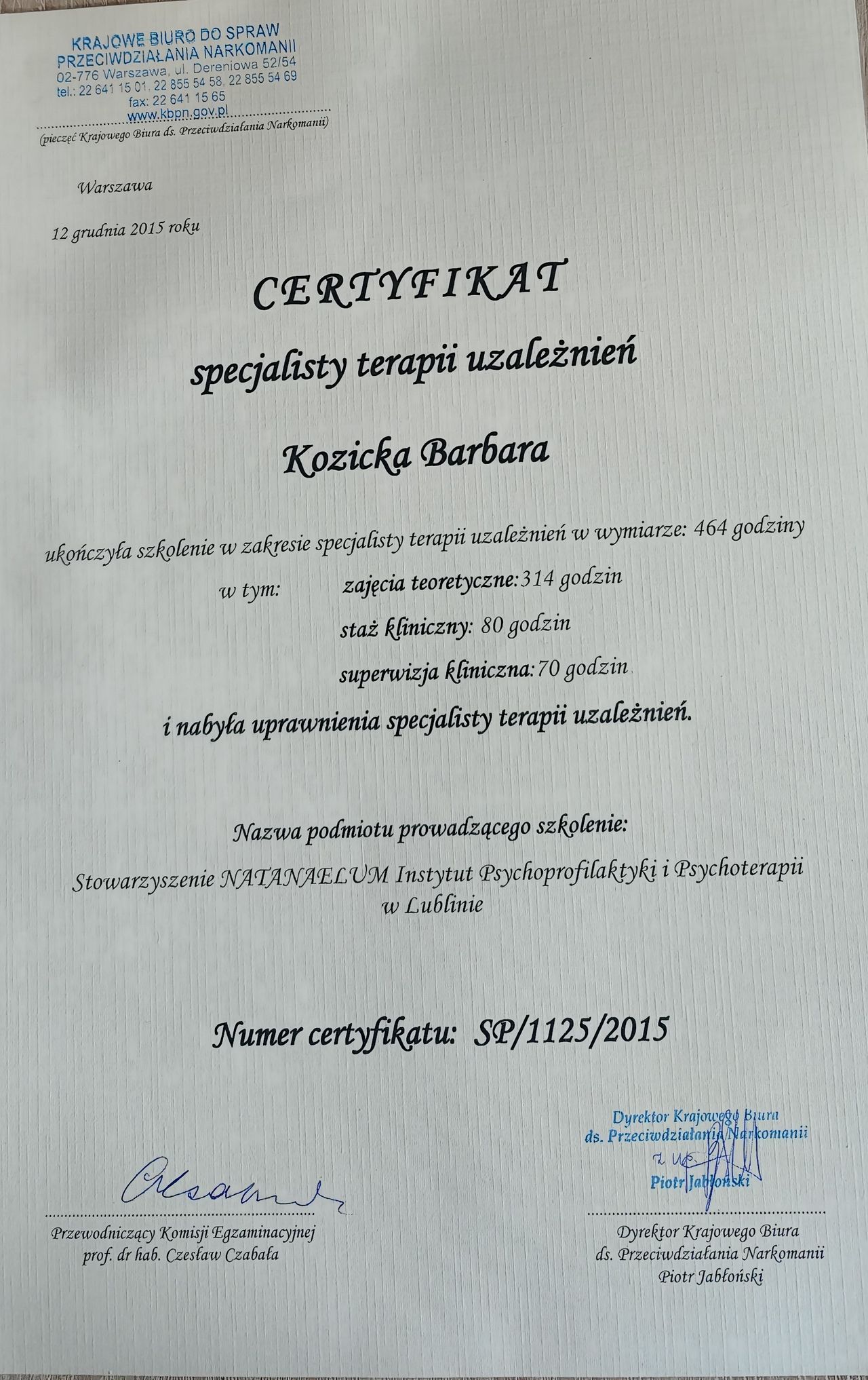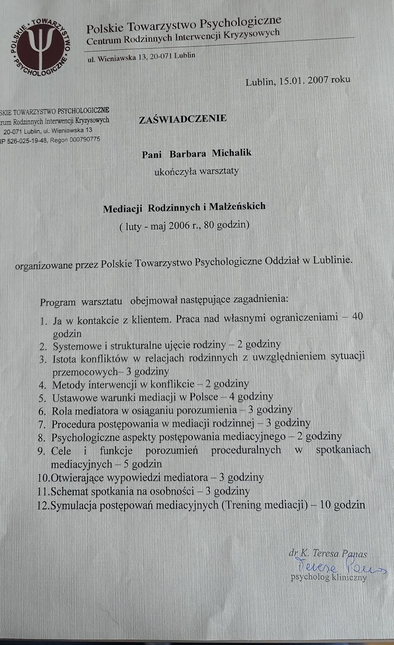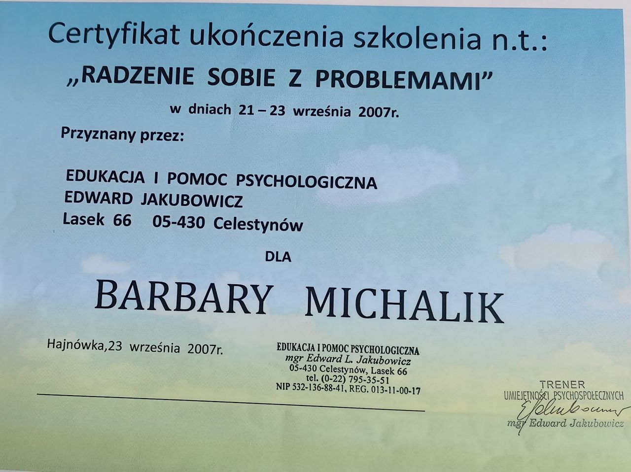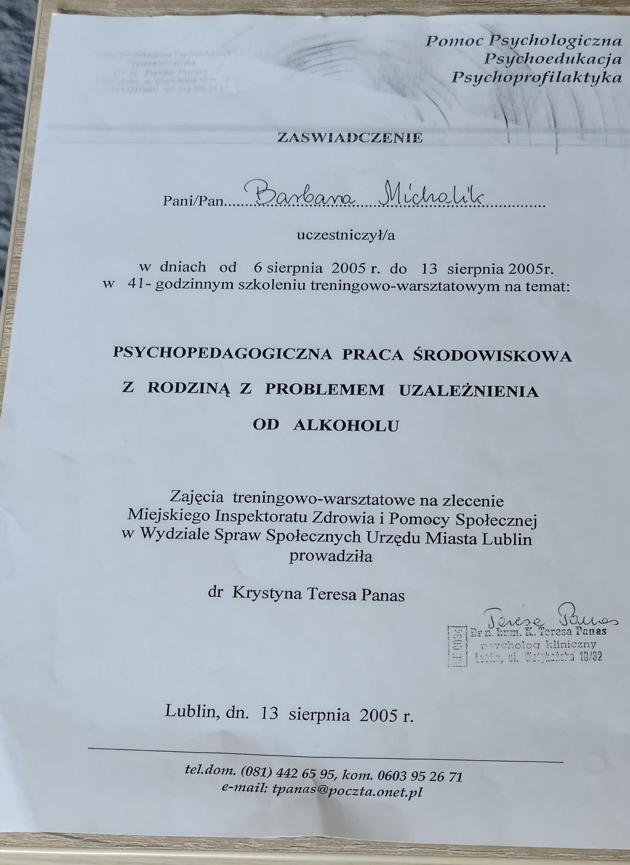 Ukończyłam studia na UMCS w Lublinie z tytułem magistra pedagogiki resocjalizacyjnej. Odbyłam szkolenie w zakresie leczenia psychoterapii uzależnień i uzyskałam certyfikat wydany przez KBdsPN Psychoterapię systemową ukończyła w Krakowskiej Fundacji Rozwoju Psychoterapii im. Profesor Marii Orwid. Obecnie jest w trakcie szkolenia uzupełniającego o modalności integracyjnej tj. „psychoterapii indywidualnej i terapii rodzin ze szczególnym uwzględnieniem problemów adolescencji”.