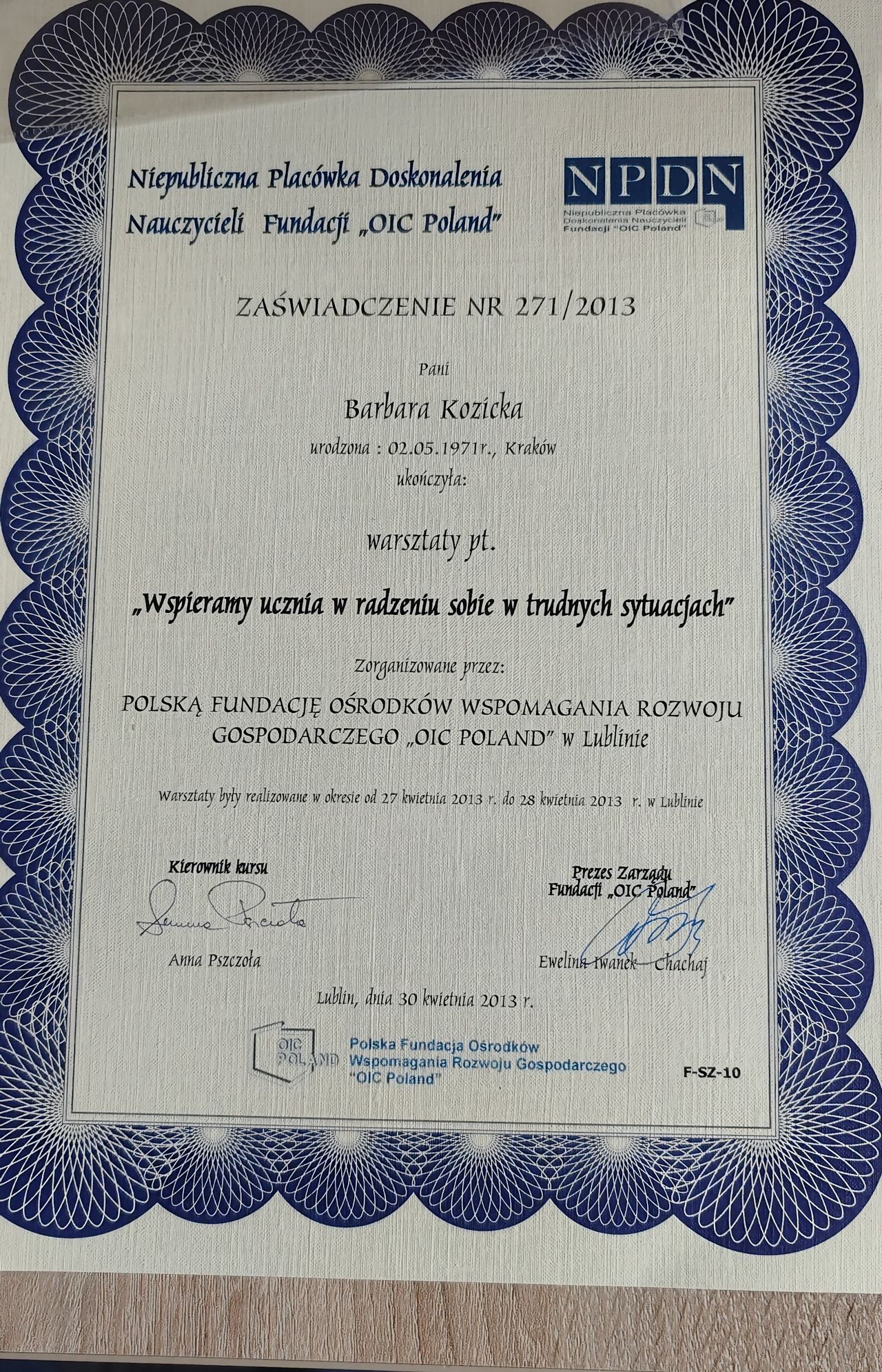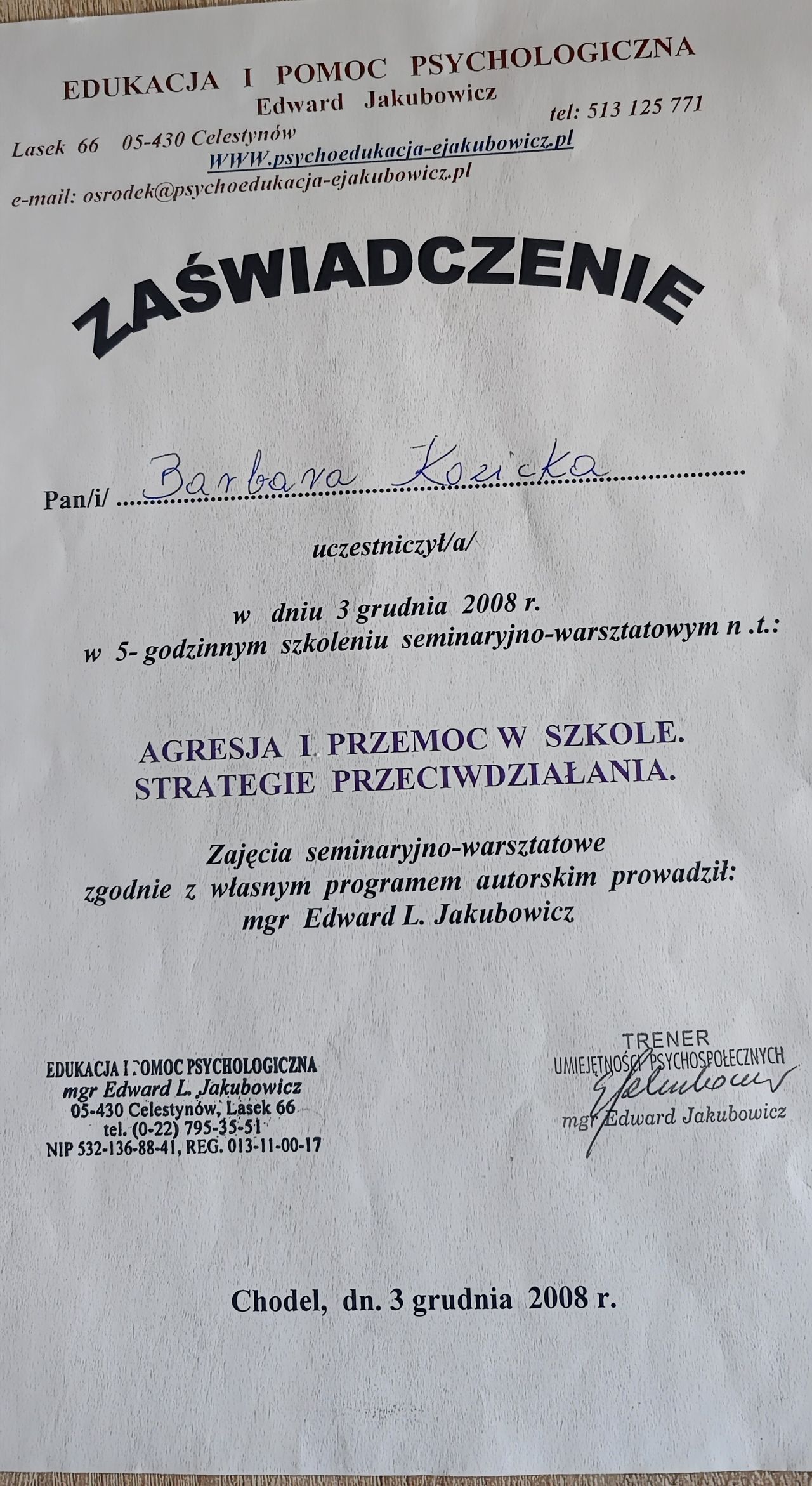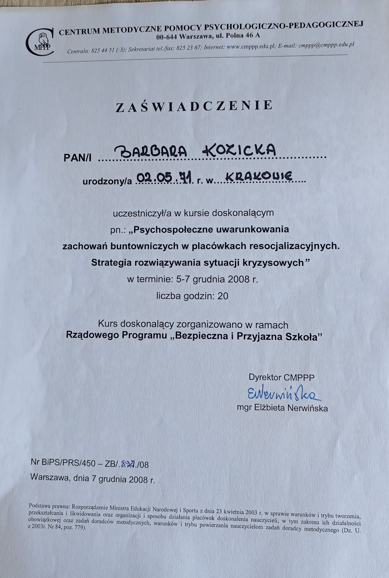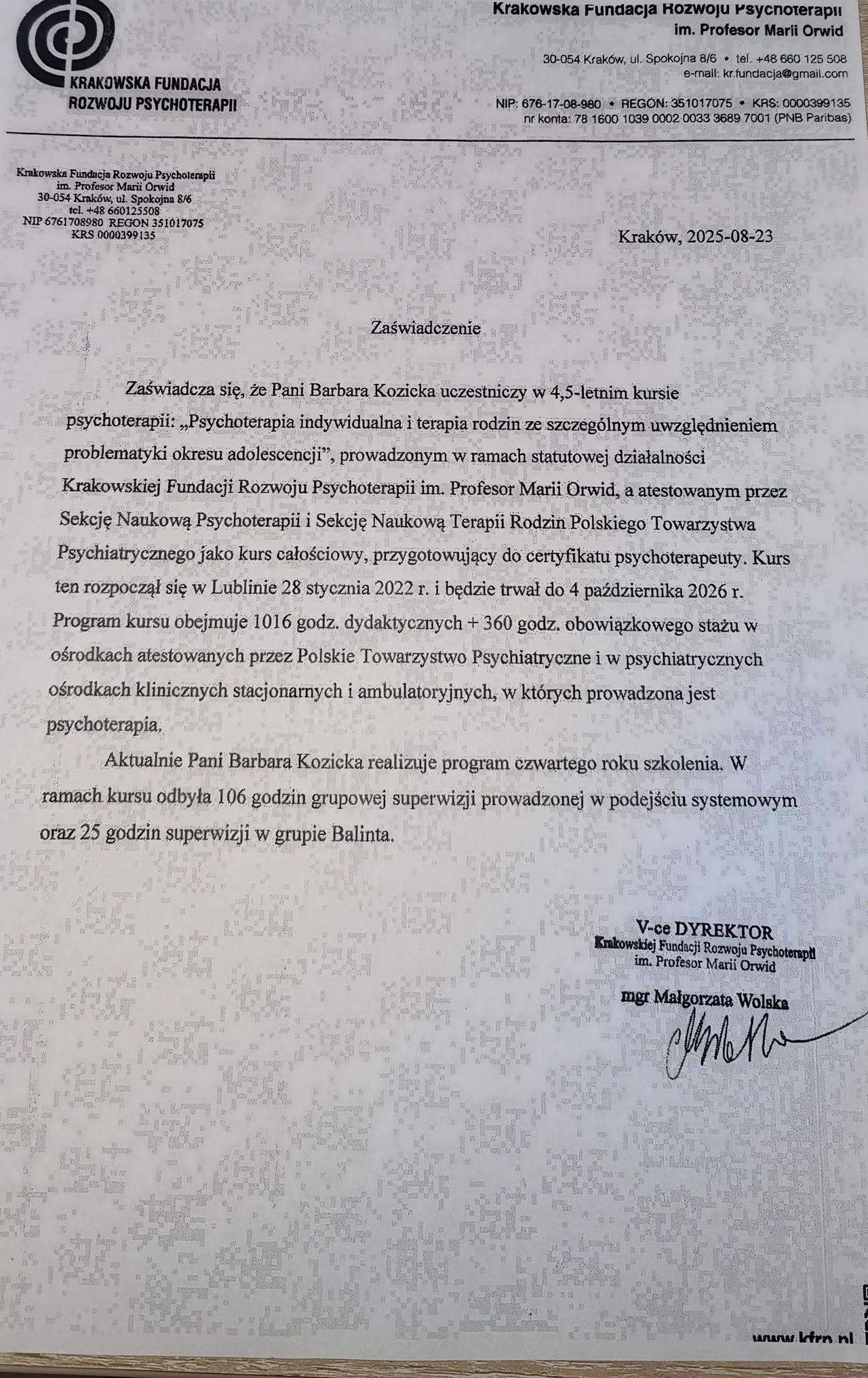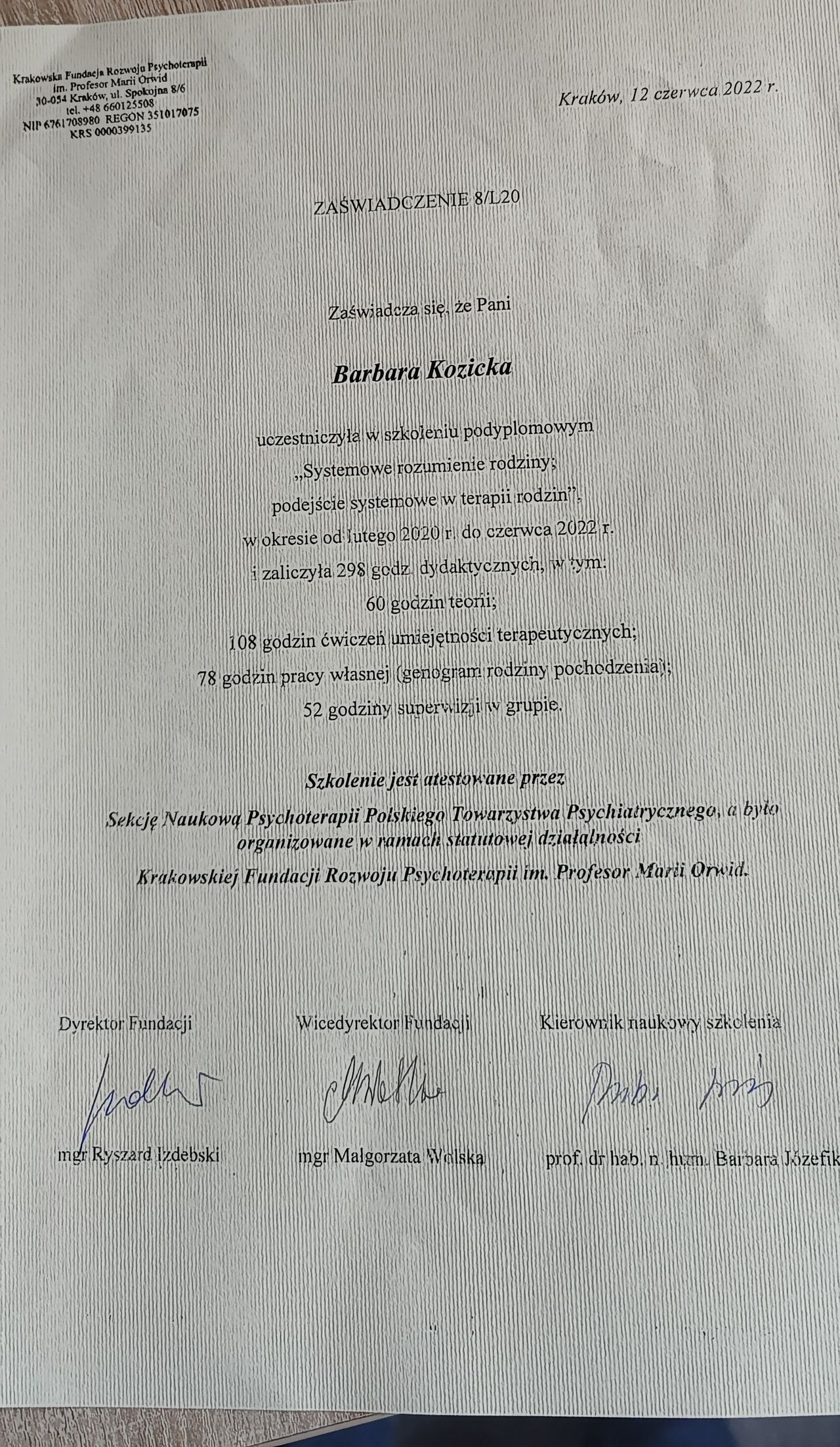 Ukończyłam studia na UMCS w Lublinie z tytułem magistra pedagogiki resocjalizacyjnej. Odbyłam szkolenie w zakresie leczenia psychoterapii uzależnień i uzyskałam certyfikat wydany przez KBdsPN Psychoterapię systemową ukończyła w Krakowskiej Fundacji Rozwoju Psychoterapii im. Profesor Marii Orwid. Obecnie jest w trakcie szkolenia uzupełniającego o modalności integracyjnej tj. „psychoterapii indywidualnej i terapii rodzin ze szczególnym uwzględnieniem problemów adolescencji”.