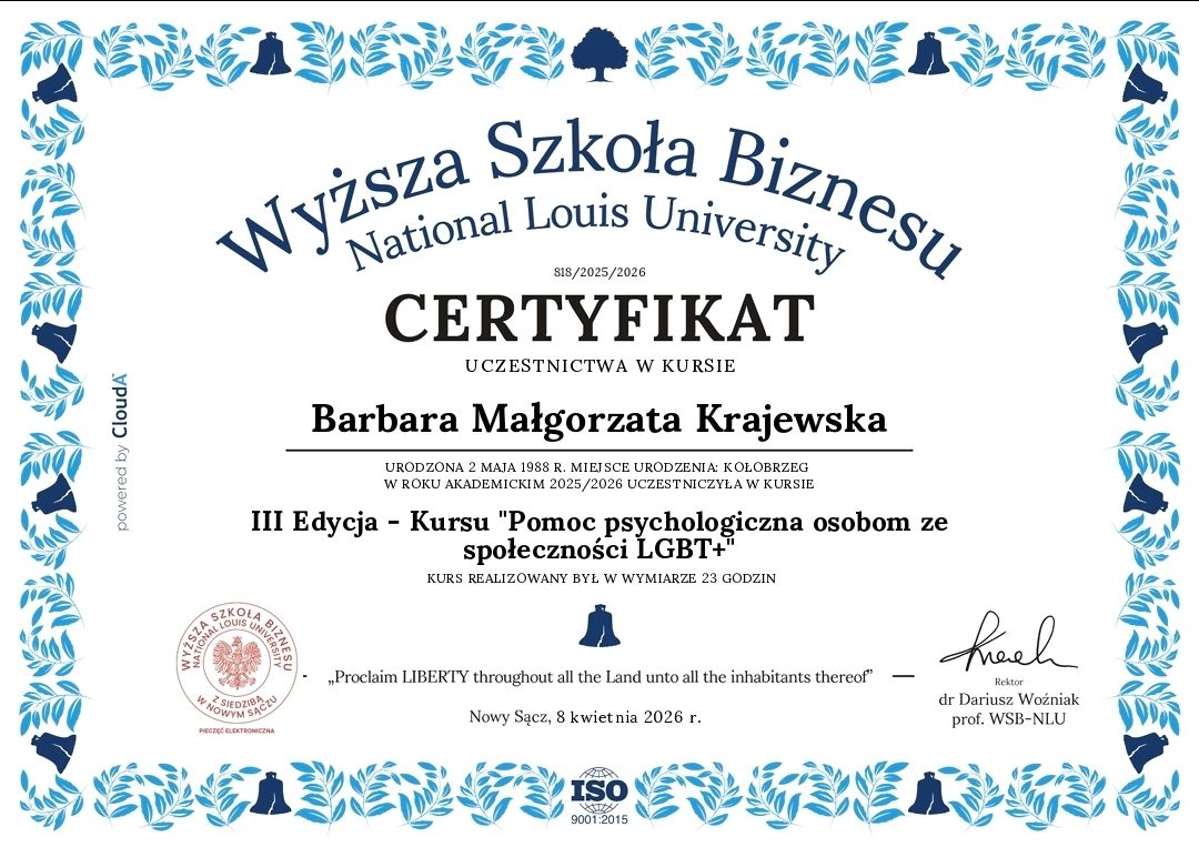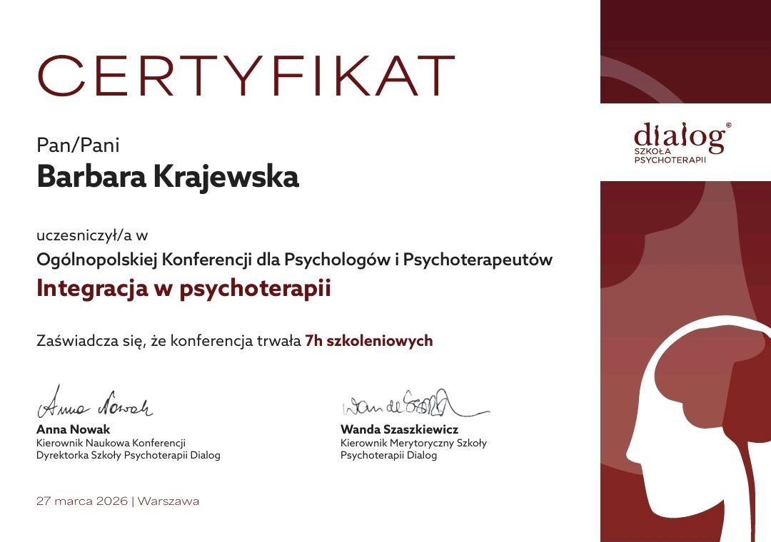 mgr Barbara Krajewska - psycholog o specjalności: psychologia kliniczna i osobowości, psychoseksuolog, psychoterapeuta w trakcie certyfikacji, terapeuta zajęciowy, absolwentka studiów podyplomowych z zakresu przygotowania pedagogicznego. Studentka Kolegium Doktorskiego. Ponadto, ukończyła Wydział Prawa i Administracji na Uniwersytecie Gdańskim. To również stały mediator sądowy z listy Sądu Okręgowego w Szczecinie. Obszar zainteresowań to: ekspertyzy krytyczne opinii psychologiczno-pedagogicznych, opiniodawstwo, diagnoza i terapia indywidualna, par, rodzinna (w tym również na zlecenie Sądu) oraz poradnictwo psychologiczne dzieci i dorosłych. Zawodowo stara się łączyć ze sobą pasję i wykształcenie. Mnogość kompetencji pozwala pomagać na wielu płaszczyznach. Udział w konferencjach naukowych oraz szkoleniach umożliwia stałe poszerzanie wiedzy i zdobywanie nowych umiejętności, które wykorzystuje w praktyce.