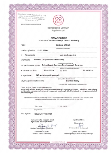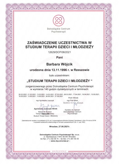 Swoje umiejętności terapeutyczne nieustannie rozwijam w ramach szkoleń oraz kursów z zakresu psychoterapii i psychologii. Swoją pracę poddaję superwizji. Moje zainteresowania zawodowe koncentrują się wokół terapii dialektyczno-behawioralnej (DBT) i technik uważności.