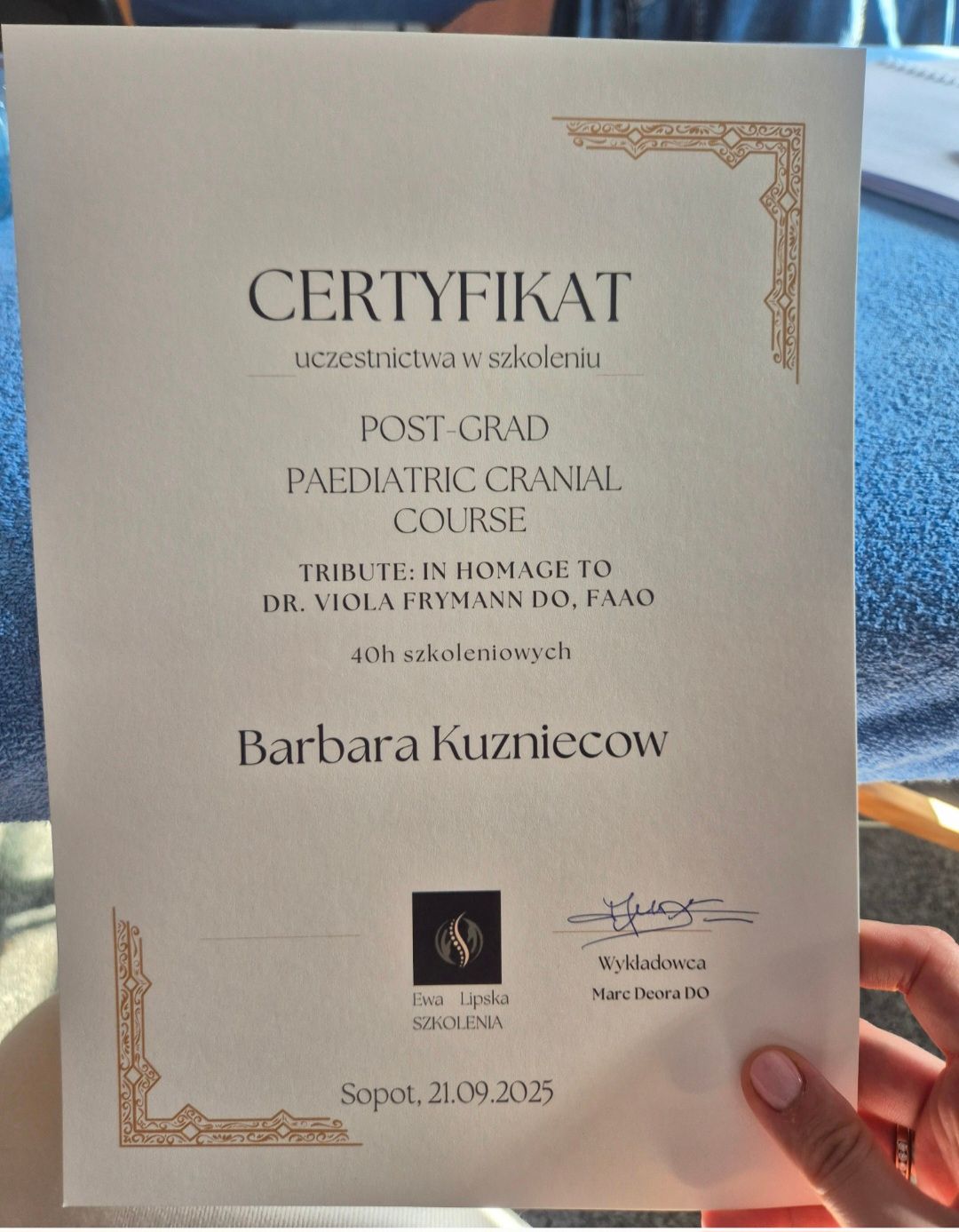 Jaki jest zakres porad oferowanych przez Barbara Kuzniecow?Barbara Kuzniecow to fizjoterapeuta. Na podstawie swojego doświadczenia i wykształcenia Barbara Kuzniecow oferuje usługi takie jak: konsultacja fizjoterapeutyczna, Fizjoterapia stawów skroniowo-żuchwowych, osteopatia, fizjoterapia stomatologiczna, fizjoterapia szczękowo- twarzowa, fizjoterapia przed- i pooperacyjna, osteopatia pediatryczna, fizjoterapia niemowląt, Fizjoterapia z wykorzystaniem technik osteopatycznych, terapia blizn.
