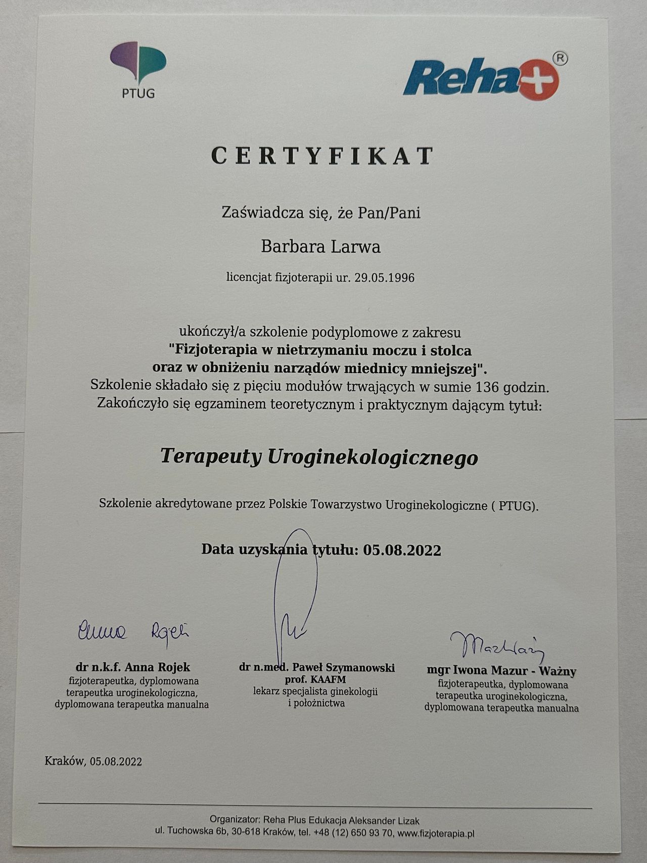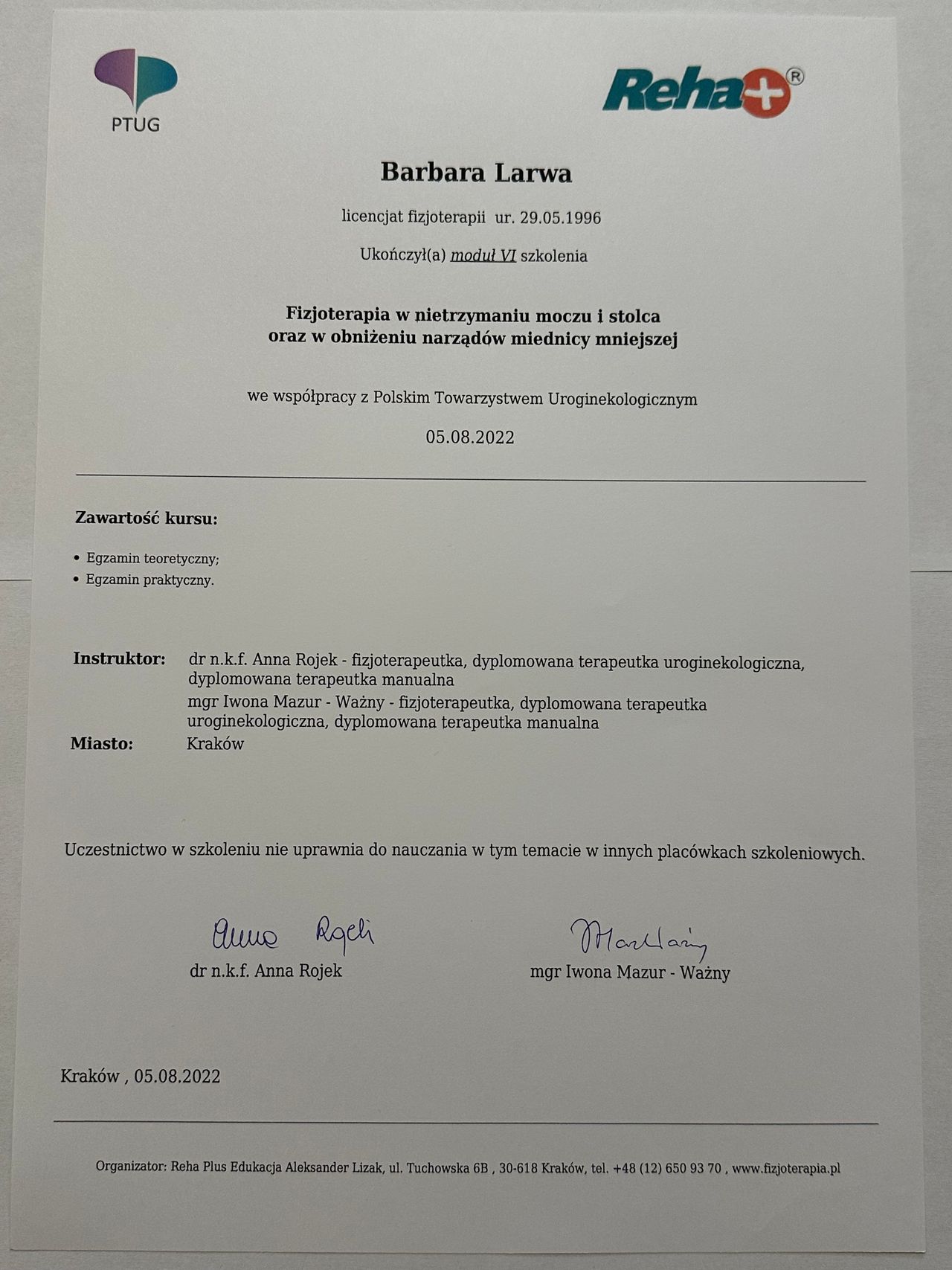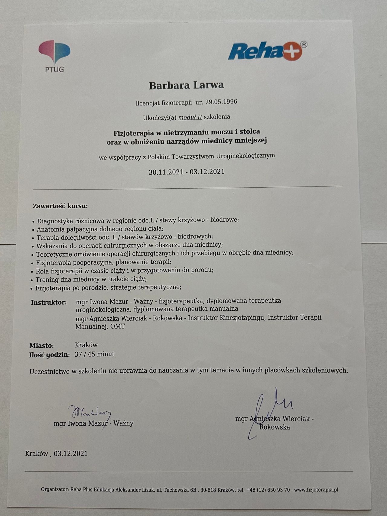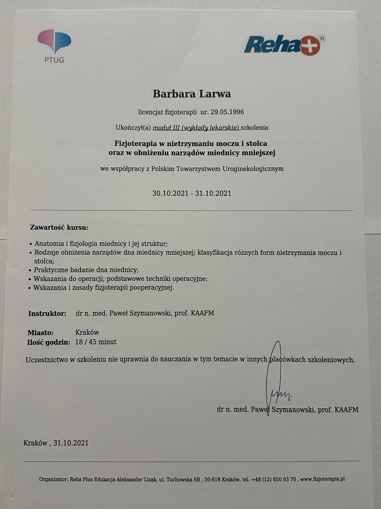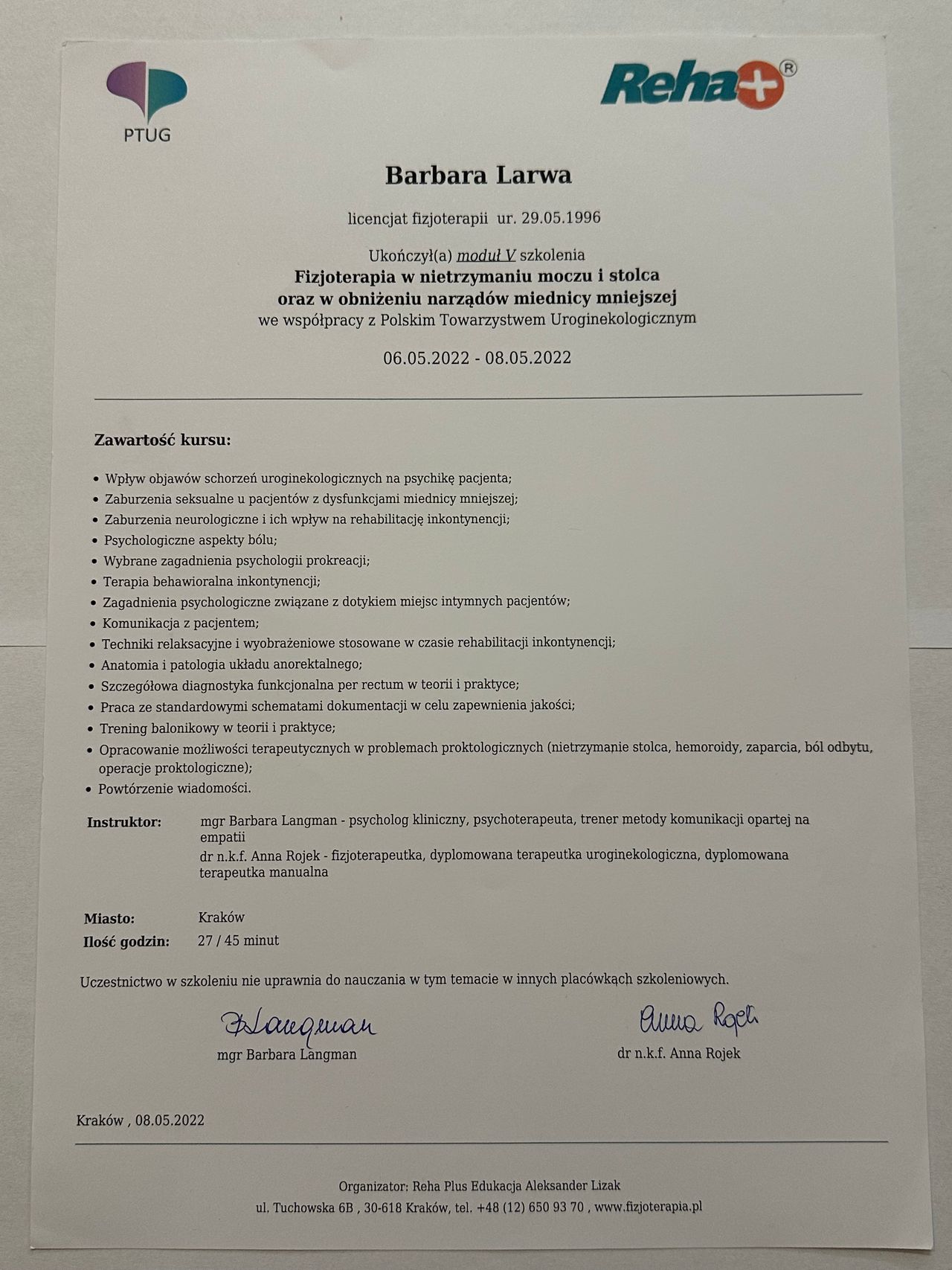 • Krakowskie Centrum Fizjoterapii i Osteopatii Osteohelp • fizjoterapia uroginekologiczna (pierwsza wizyta) •