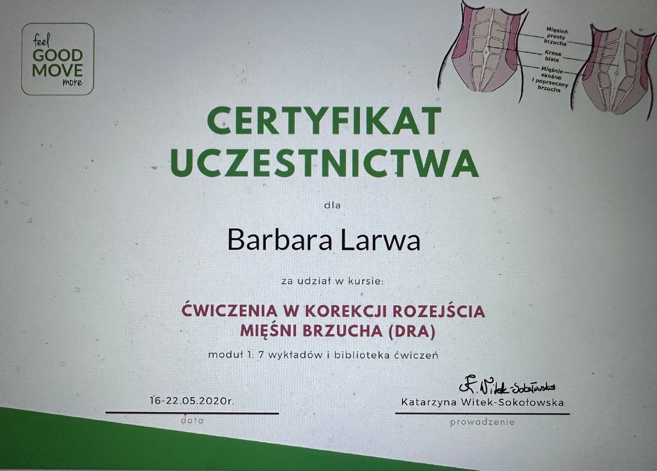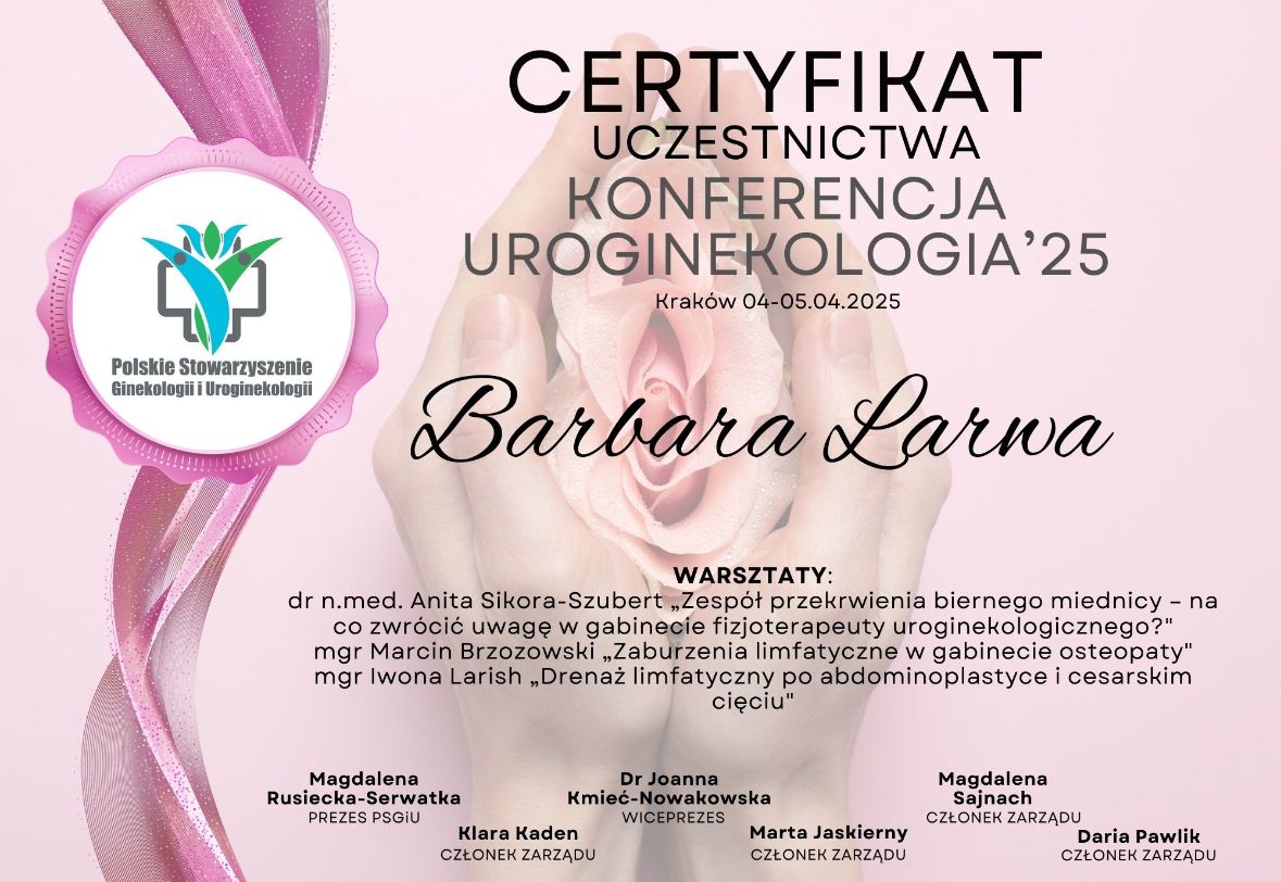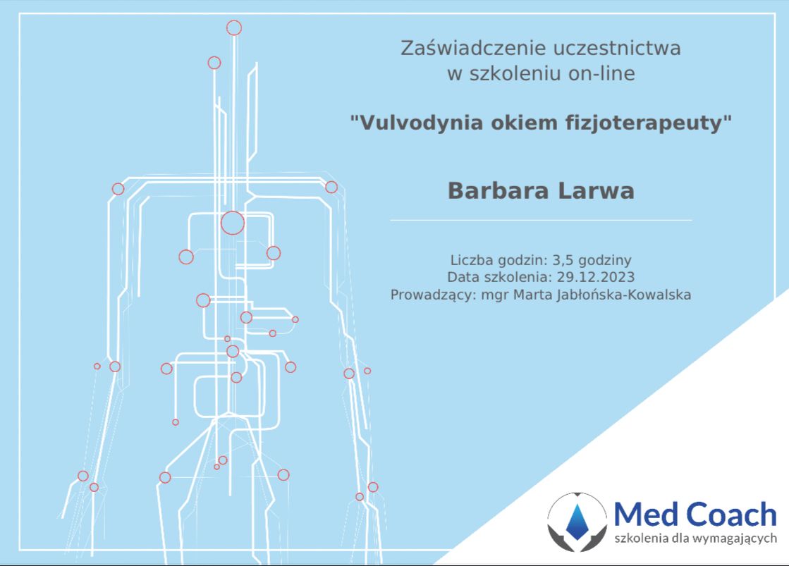 Jaki jest zakres porad oferowanych przez Barbara Larwa?Barbara Larwa to fizjoterapeuta. Na podstawie swojego doświadczenia i wykształcenia Barbara Larwa oferuje usługi takie jak: konsultacja fizjoterapeutyczna, Fizjoterapia endometriozy, fizjoterapia kobiet w ciąży / fizjoterapia okołoporodowa, fizjoterapia przed- i pooperacyjna, rehabilitacja uroginekologiczna, fizjoterapia uroginekologiczna, fizjoterapia uroginekologiczna (pierwsza wizyta), fizjoterapia uroginekologiczna - bóle miesiączkowe i endometrioza, fizjoterapia uroginekologiczna - dysfunkcje seksualne, fizjoterapia uroginekologiczna - nietrzymanie moczu.