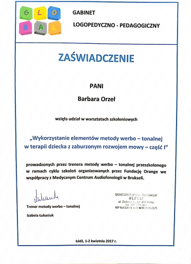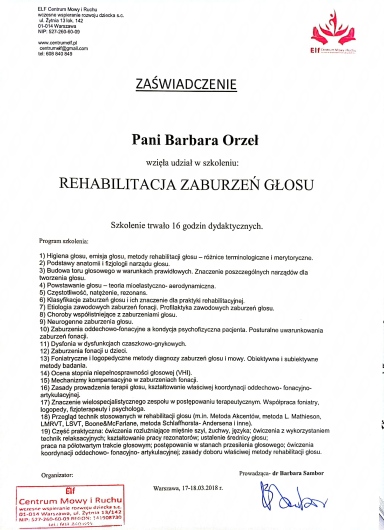 Jaki jest zakres porad oferowanych przez Barbara Orzeł?Barbara Orzeł to logopeda. Na podstawie swojego doświadczenia i wykształcenia Barbara Orzeł oferuje usługi takie jak: terapia logopedyczna, konsultacja logopedyczna, badania diagnostyczne, Diagnoza Neuroflow, Afirmacja głosu, kontrola po zabiegu, konsultacja online.