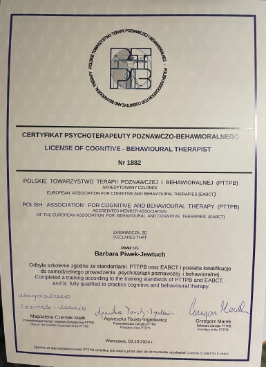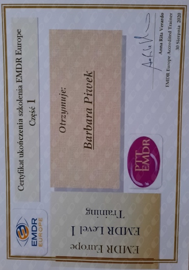 Jestem psychologiem (Uniwersytet Humanistyczno-Społeczny SWPS na kierunku psychologia społeczna ukończony z wyróżnieniem w 2017 r.), certyfikowaną psychoterapeutką poznawczo-behawioralną (Akademia Motywacji i Edukacji), interwentką kryzysową, oraz psychotraumatologiem (roczne studia podyplomowe, uk.2023r.). Jestem także członkinią Polskiego Towarzystwa Terapii EMDR, Association for Contextual Behavioral Science oraz Polskiego Towarzystwa Terapii Poznawczo-Behawioralnej. W swojej pracy przykładam dużą wagę do ciągłego rozwijania moich umiejętności poprzez uczestnictwo w szkoleniach i kursach. Praktykę zawodową zdobywałam m.in. w Ośrodku Wsparcia dla Osób po Kryzysie Psychicznym w Warszawie oraz w Instytucie Psychiatrii i Neurologii, a także pracując jako psycholog wspierający rodziny imigrantów w Holandii.