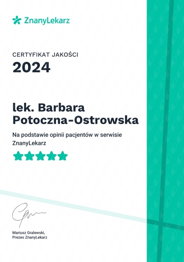Jak Barbara Potoczna-Ostrowska umawia wizyty?Barbara Potoczna-Ostrowska używa kalendarza ZnanyLekarz, dlatego na stronie widzisz aktualne terminy. Wystarczy, że wybierzesz datę i godzinę, które odpowiadają Ci najbardziej. Umawianie wizyty jest darmowe, a tuż przed terminem wyślemy Ci przypomnienie.