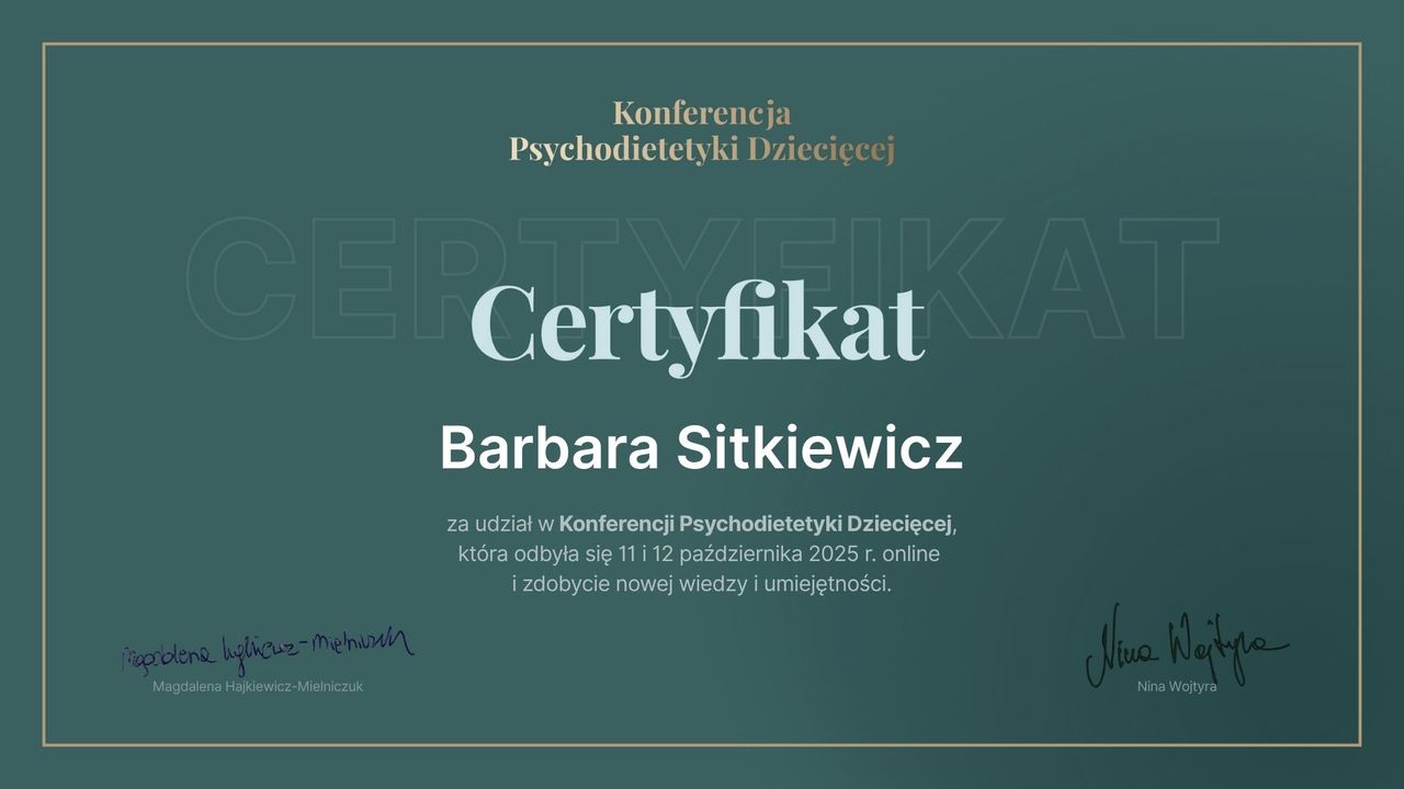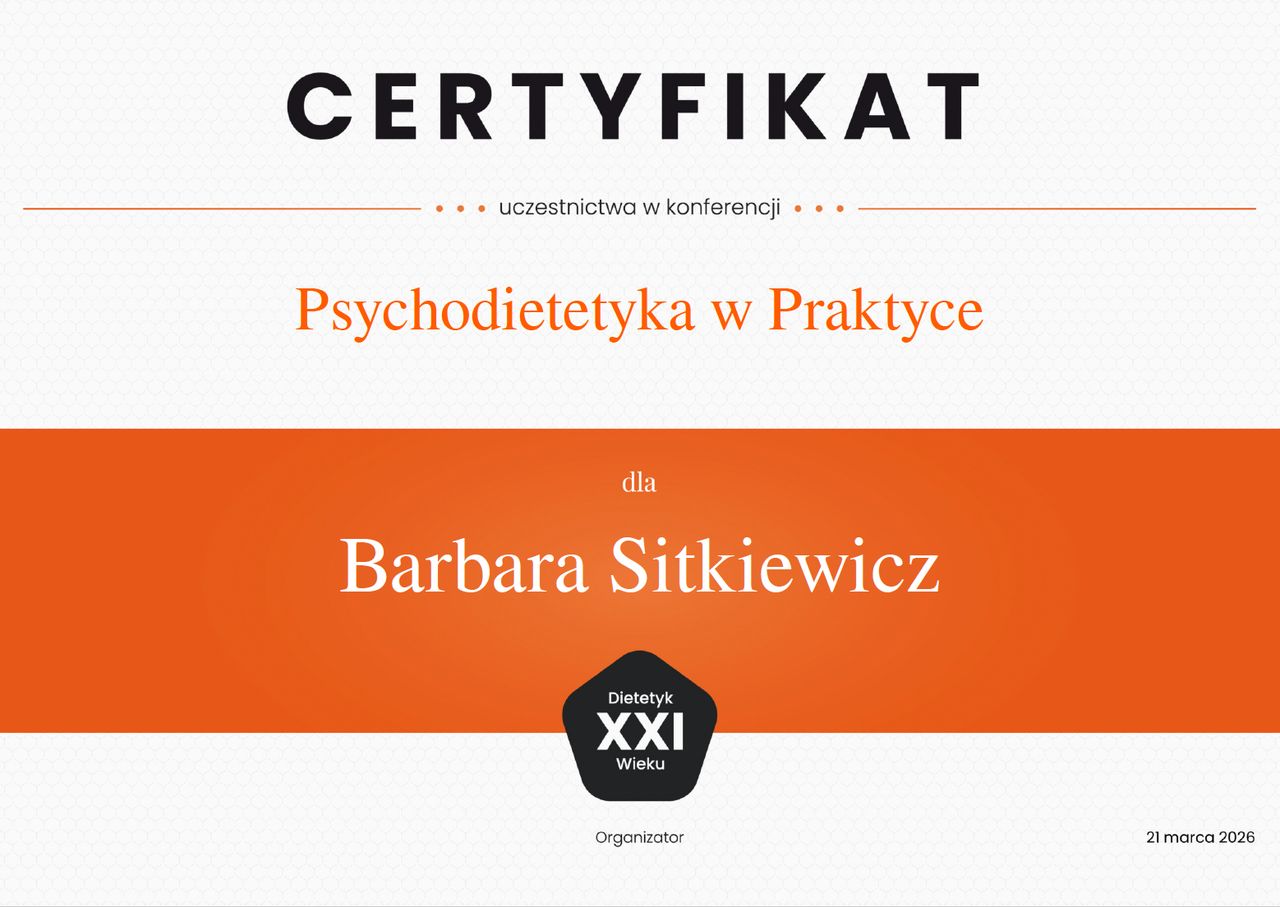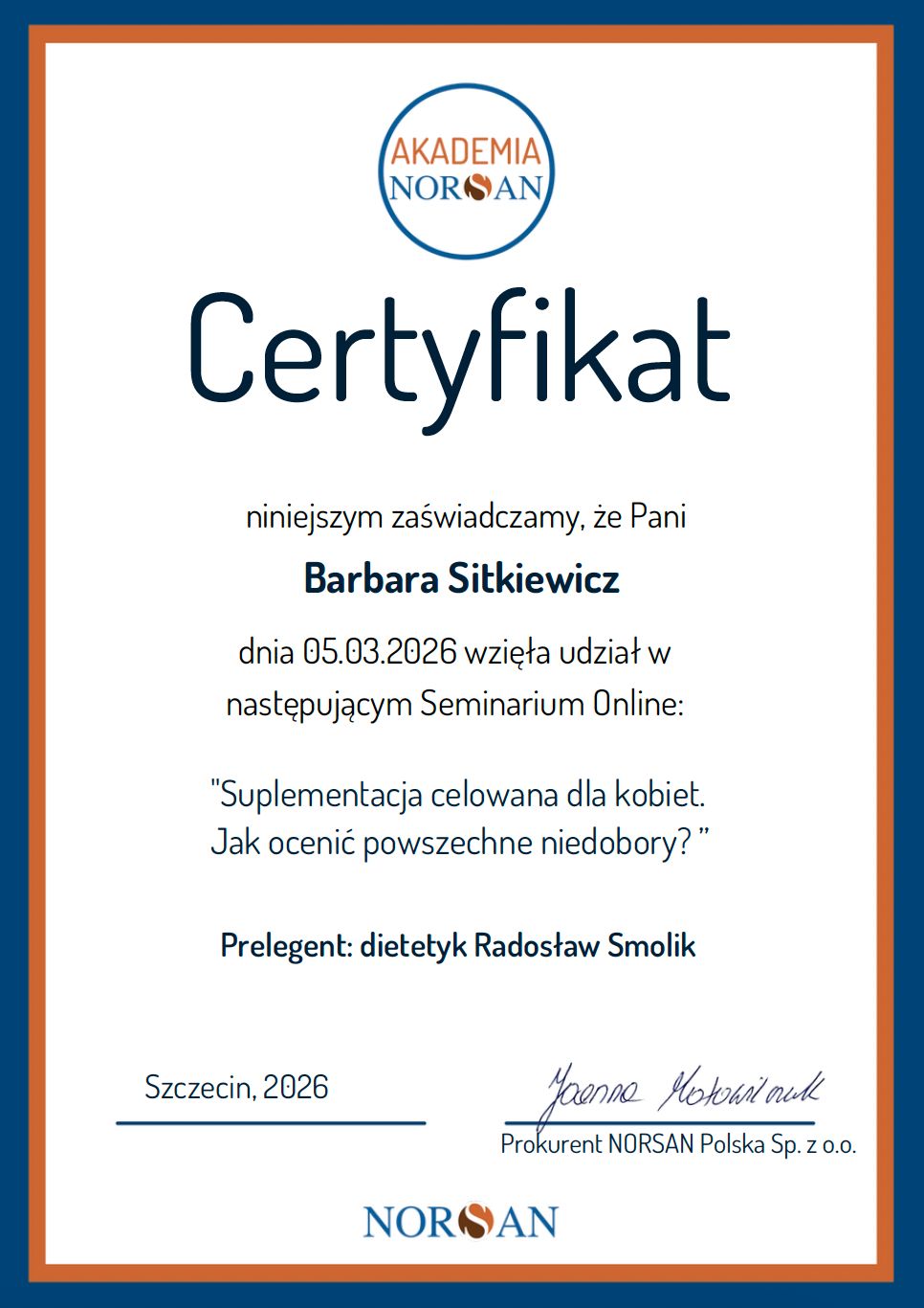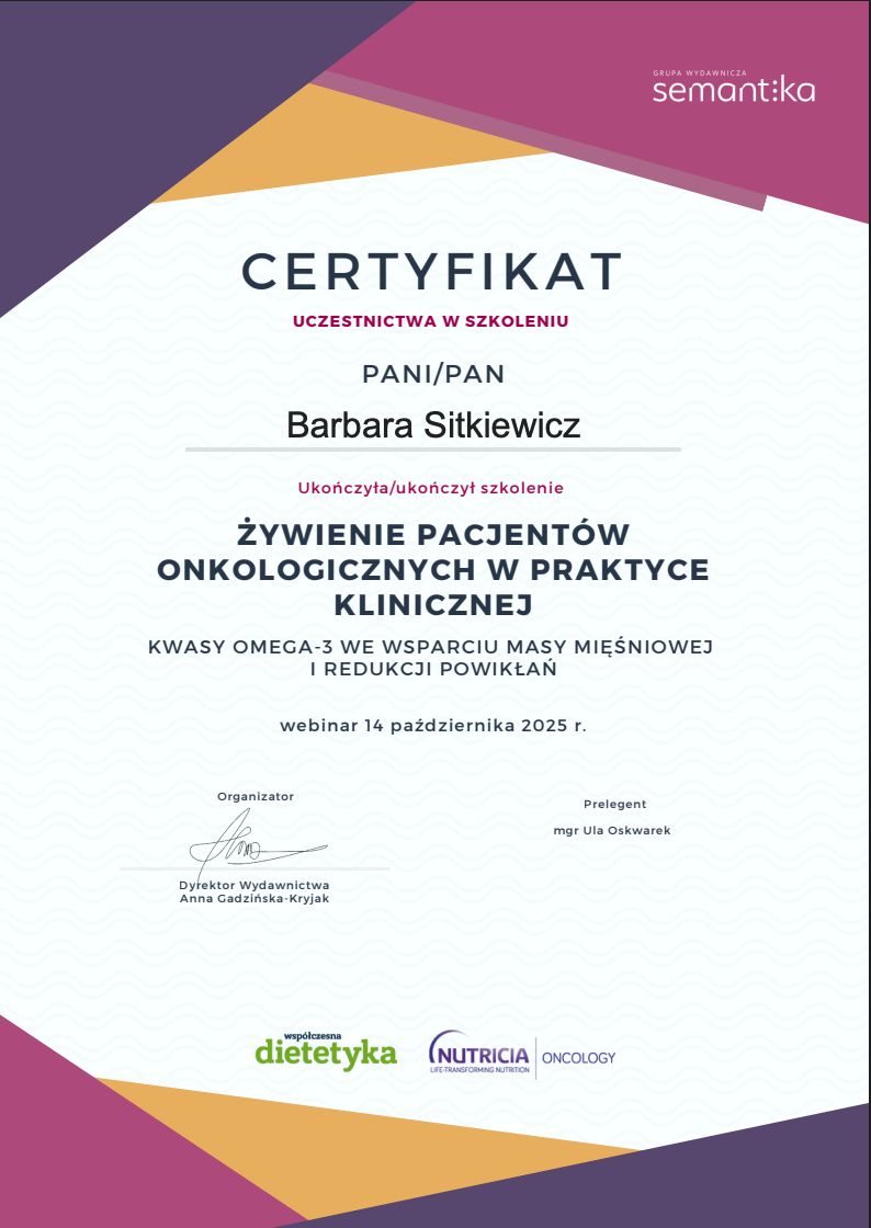 Jestem certyfikowanym specjalistą przyjaznym insulinoopornym, wpisanym na stronę Fundacji Insulinooporność Moje podejście do dietoterapii jest holistyczne – opiera się na stałej komunikacji i budowaniu zdrowych nawyków, a nie na restrykcyjnych jadłospisach.