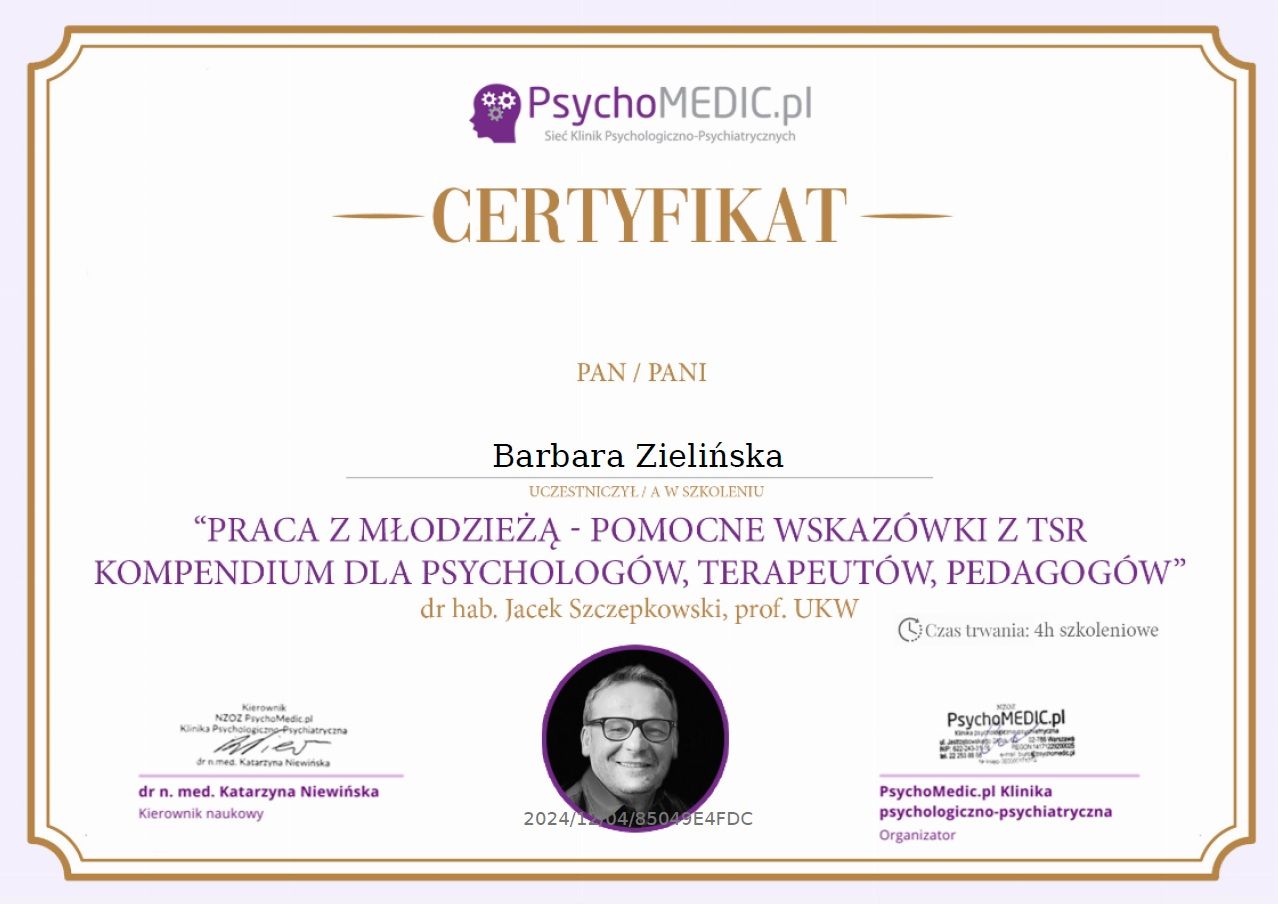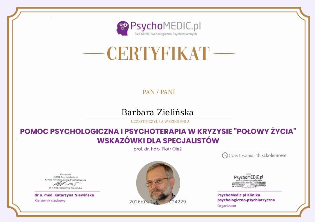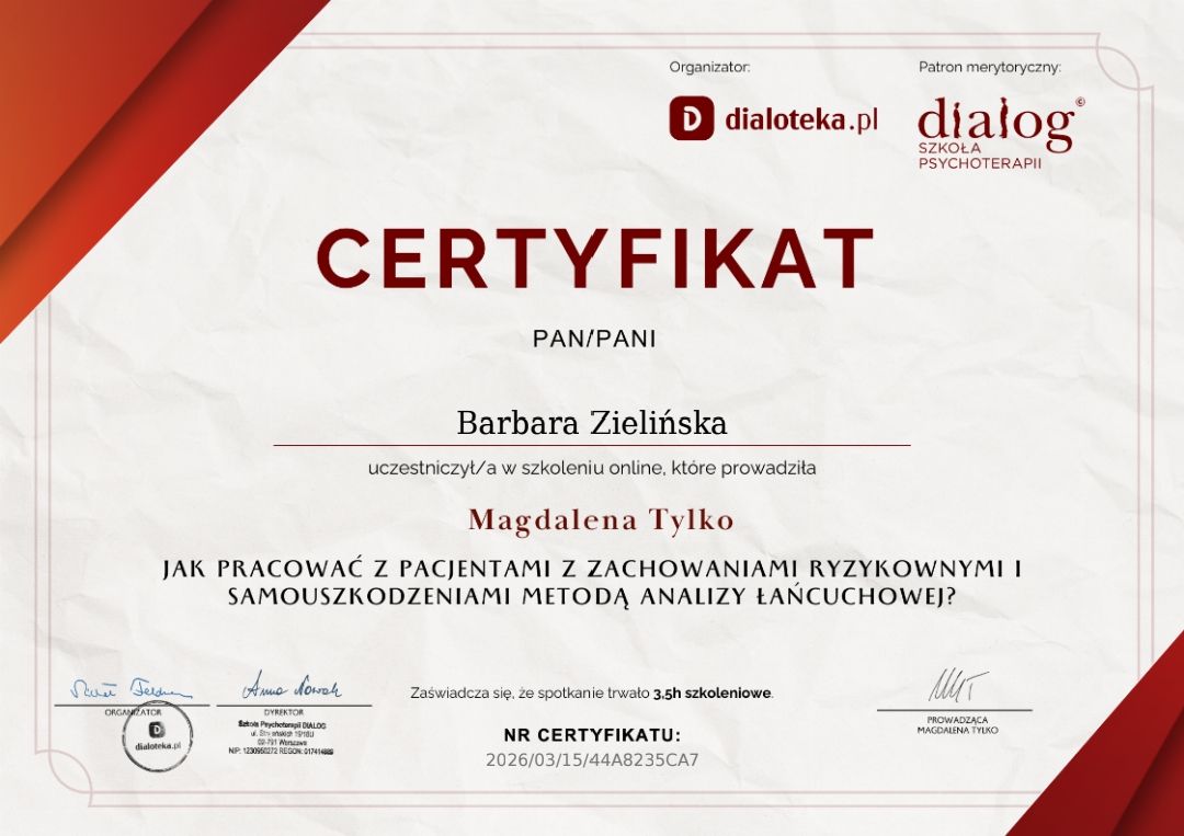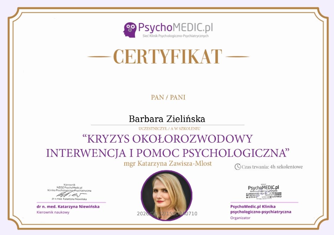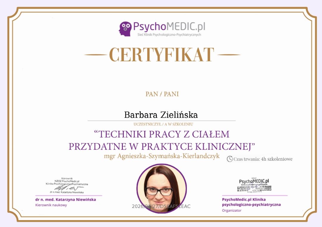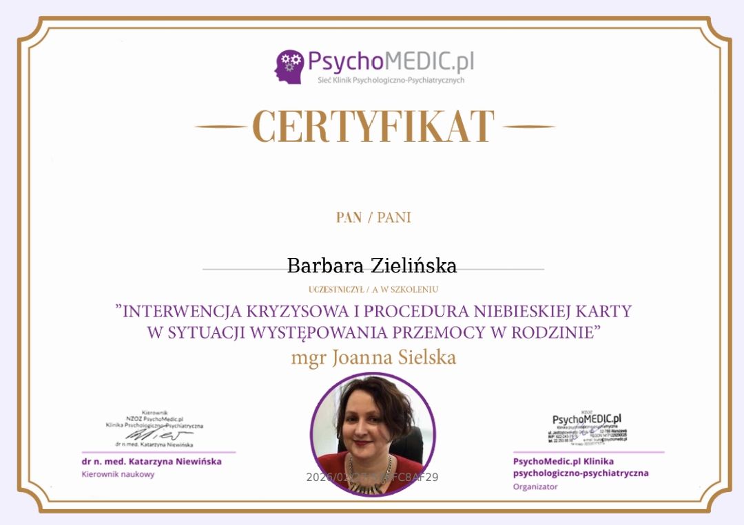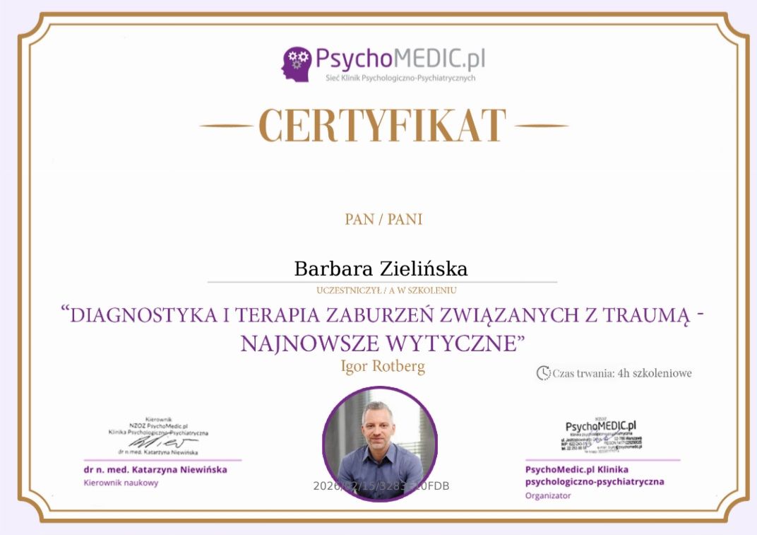 Stale się doskonalę, bo wierzę, że aktualna wiedza i empatyczne towarzyszenie naprawdę robią różnicę. W najbliższym czasie rozpoczynam studia podyplomowe z psychotraumatologii na Akademii Humanistyczno-Ekonomicznej w Łodzi.