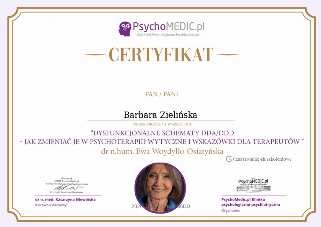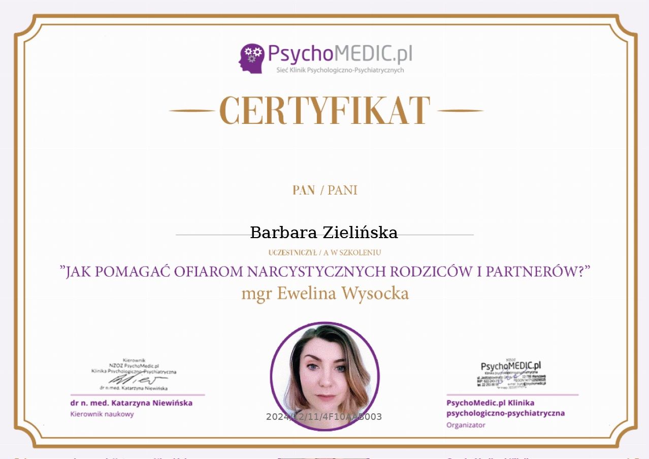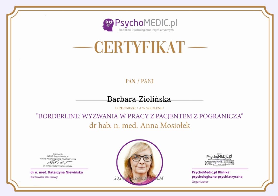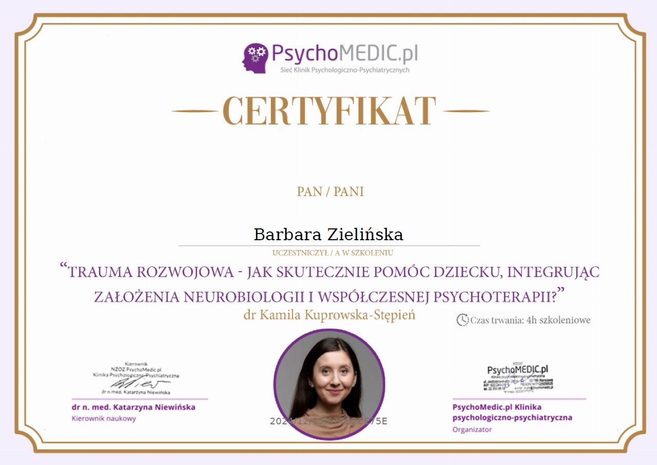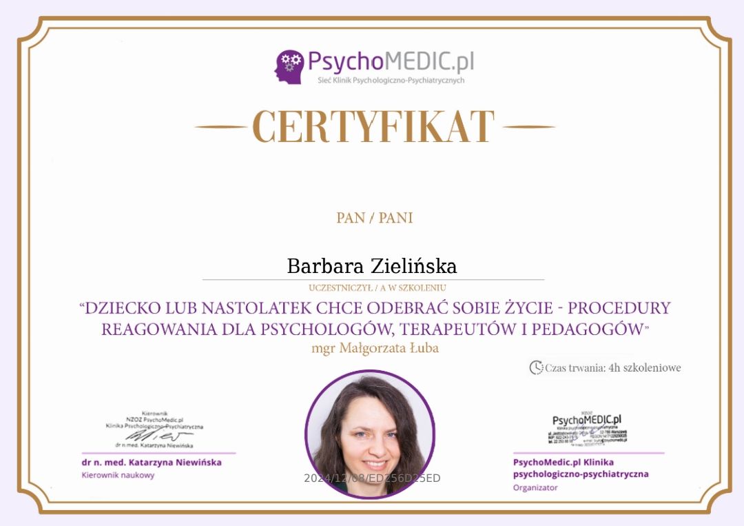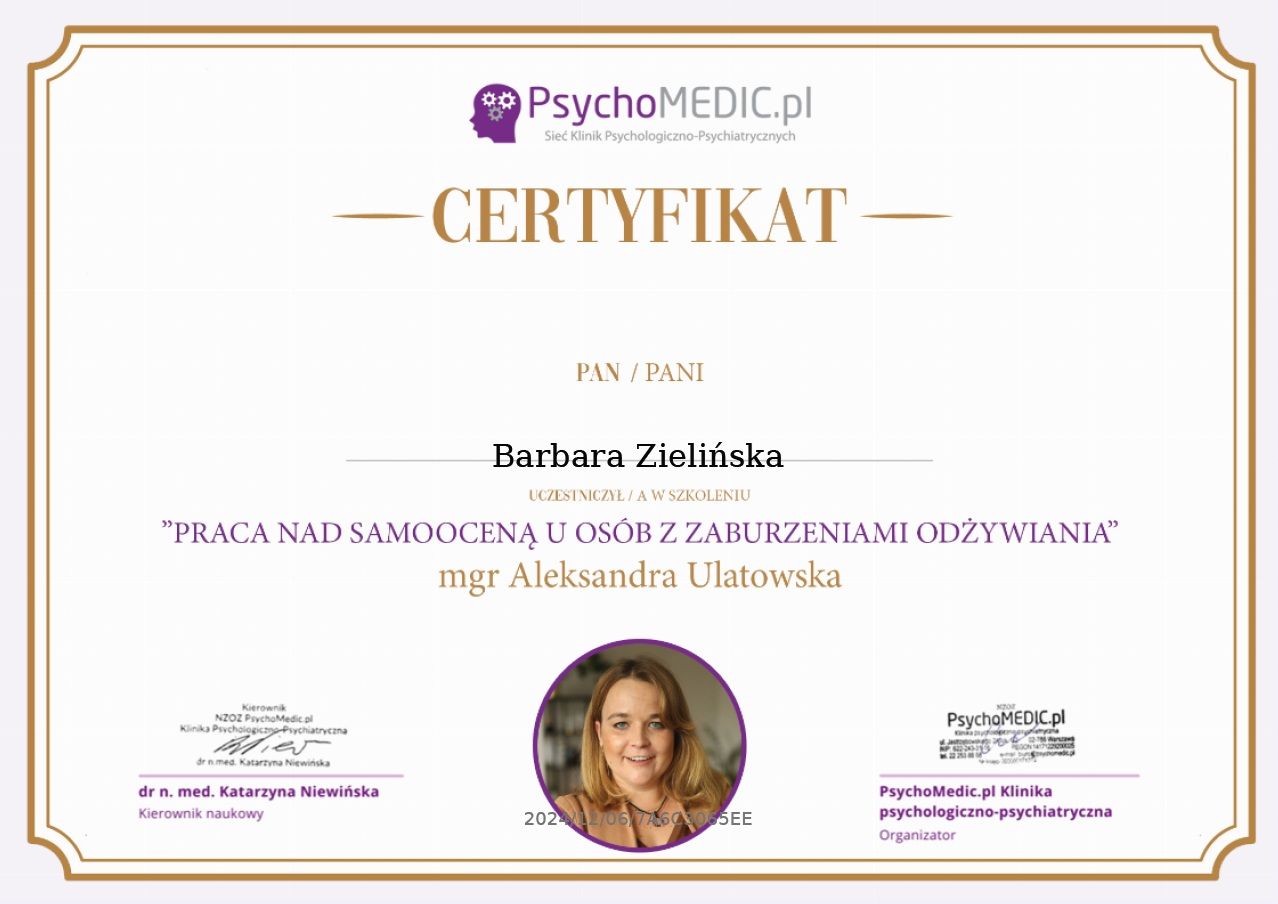 Stale się doskonalę, bo wierzę, że aktualna wiedza i empatyczne towarzyszenie naprawdę robią różnicę. W najbliższym czasie rozpoczynam studia podyplomowe z psychotraumatologii na Akademii Humanistyczno-Ekonomicznej w Łodzi.