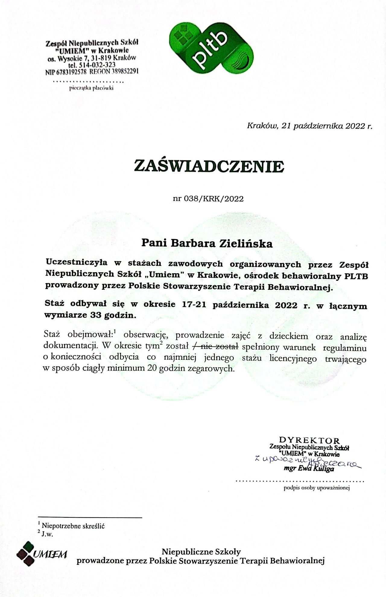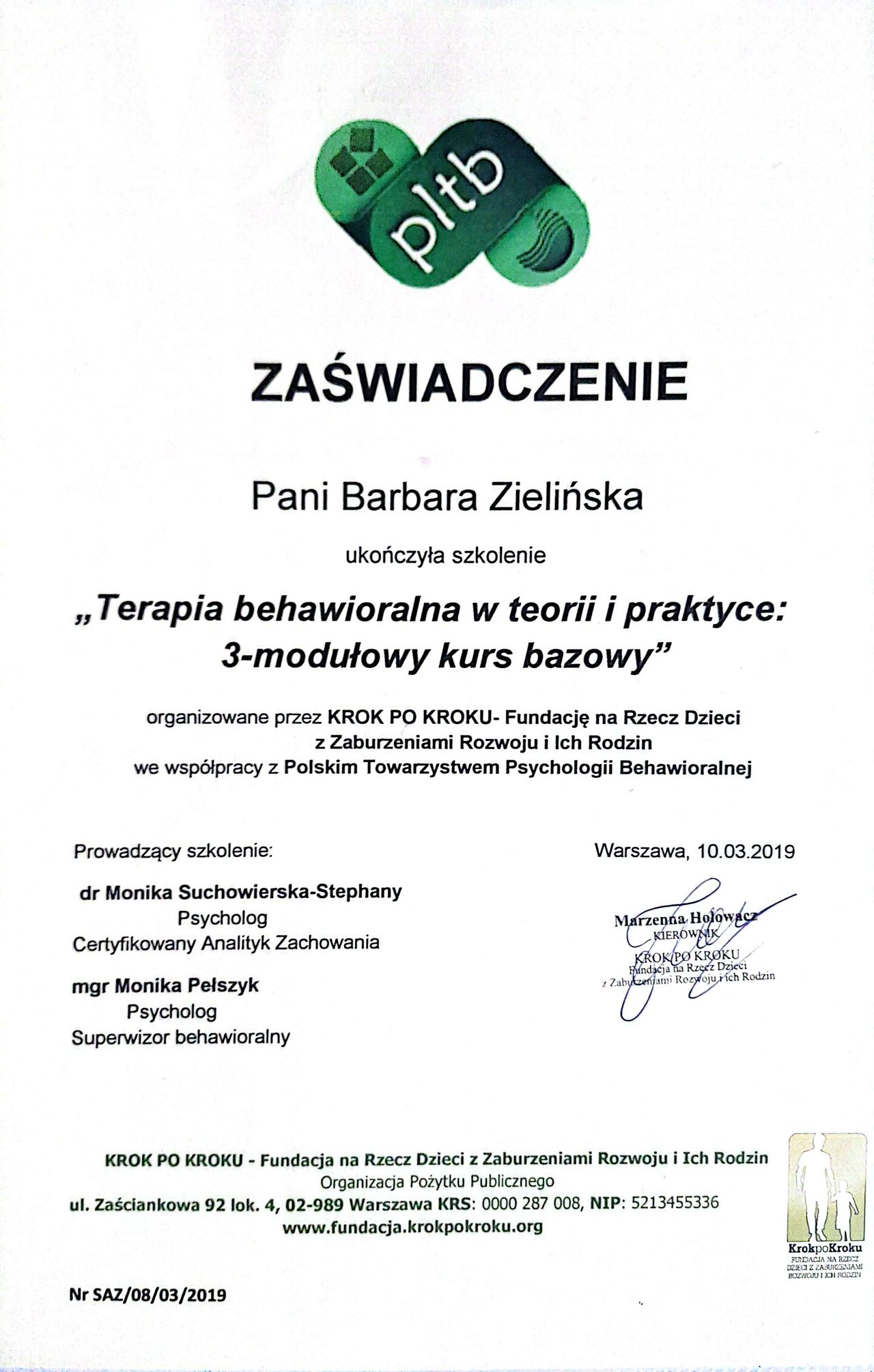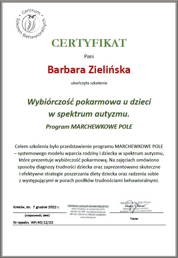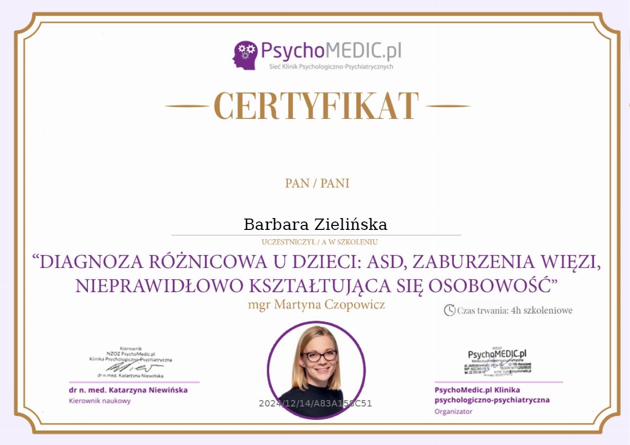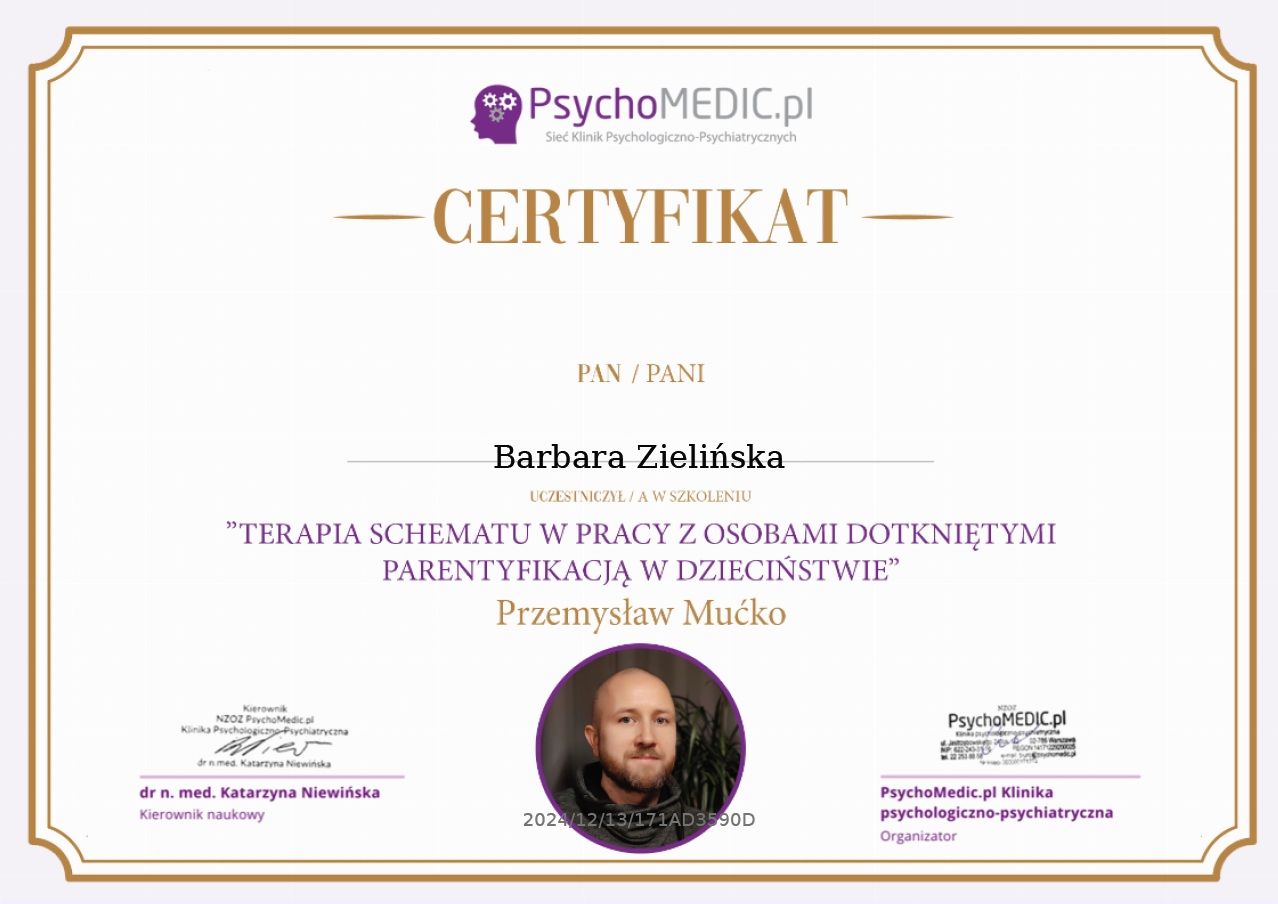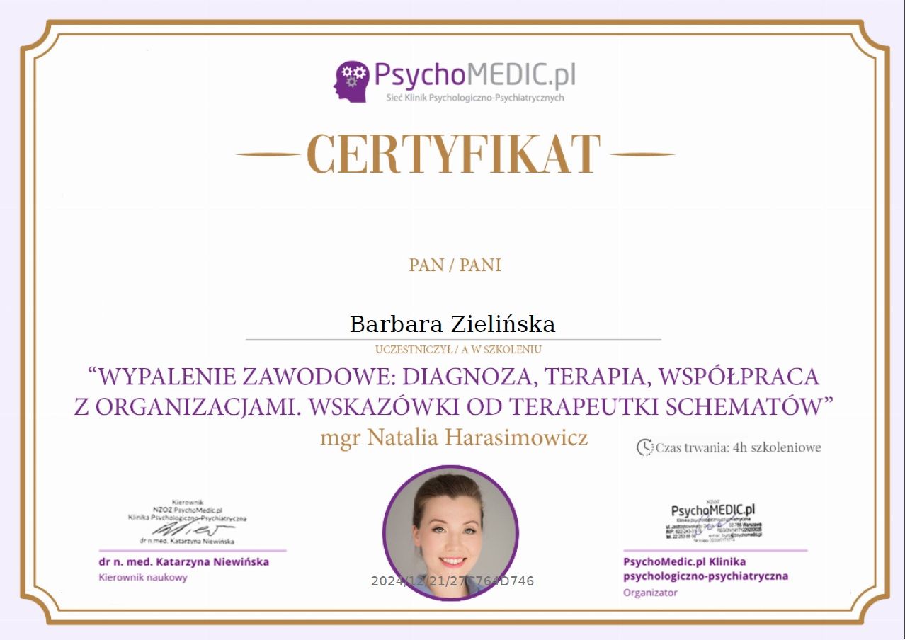 Stale się doskonalę, bo wierzę, że aktualna wiedza i empatyczne towarzyszenie naprawdę robią różnicę. W najbliższym czasie rozpoczynam studia podyplomowe z psychotraumatologii na Akademii Humanistyczno-Ekonomicznej w Łodzi.