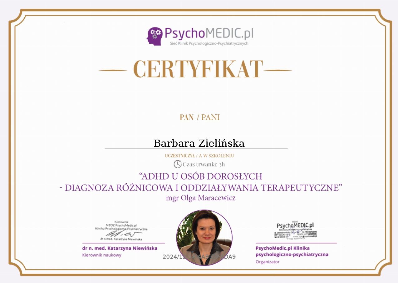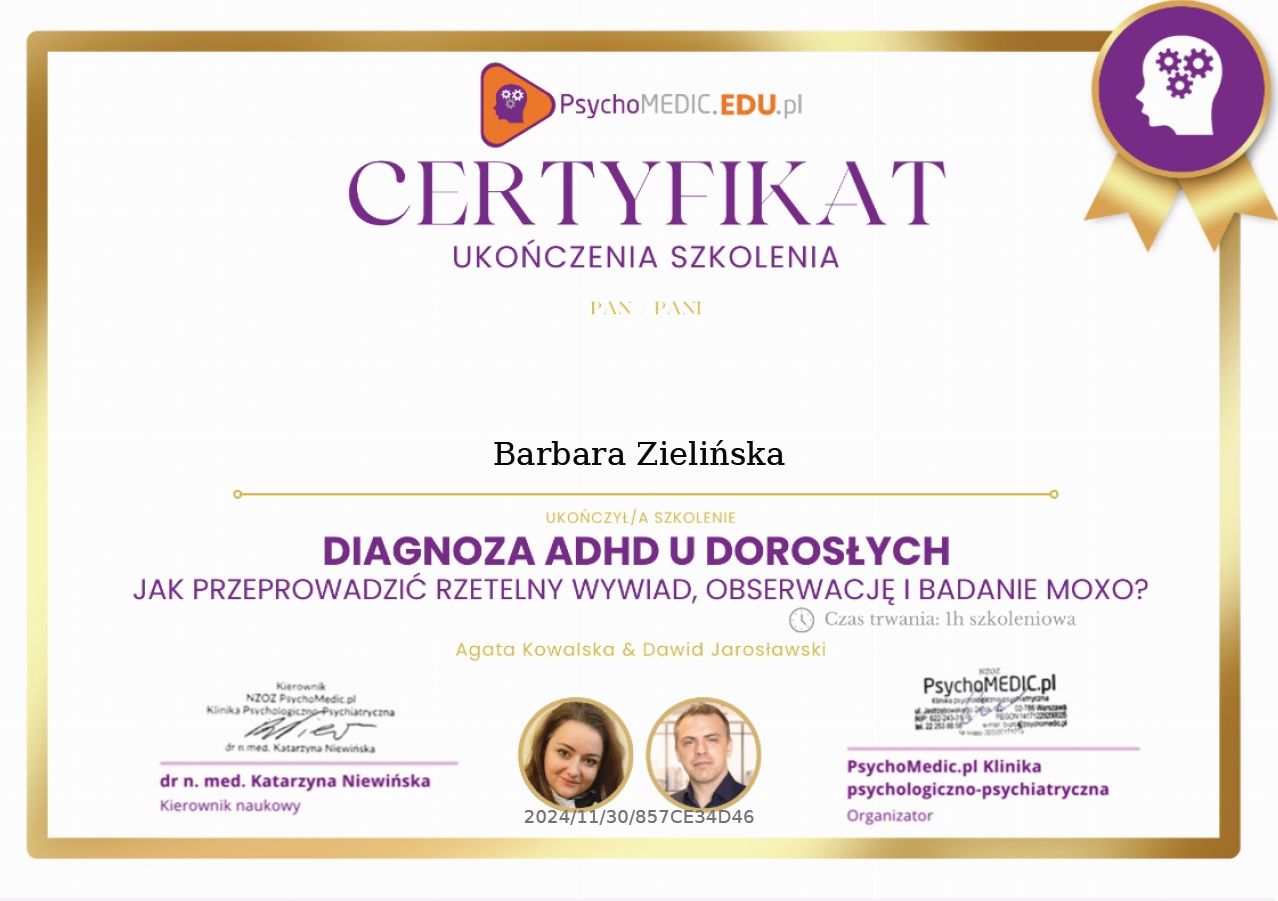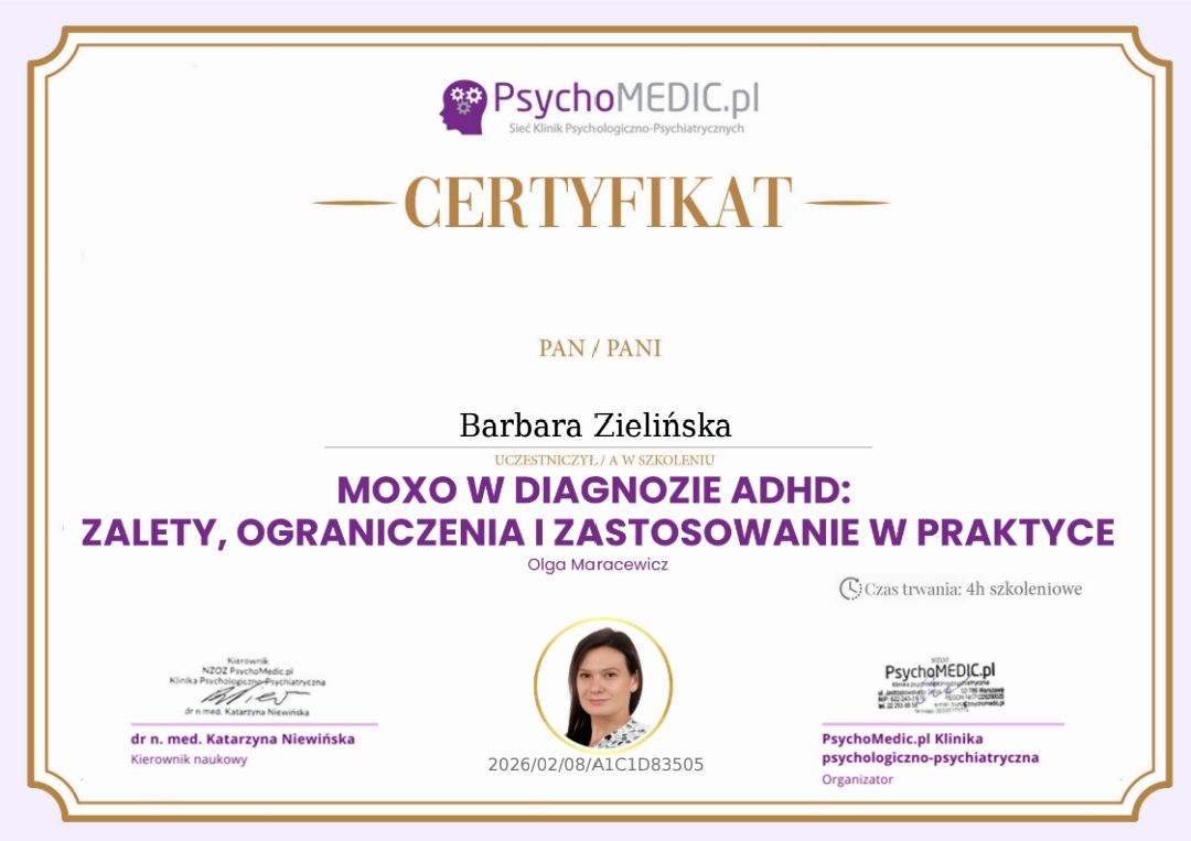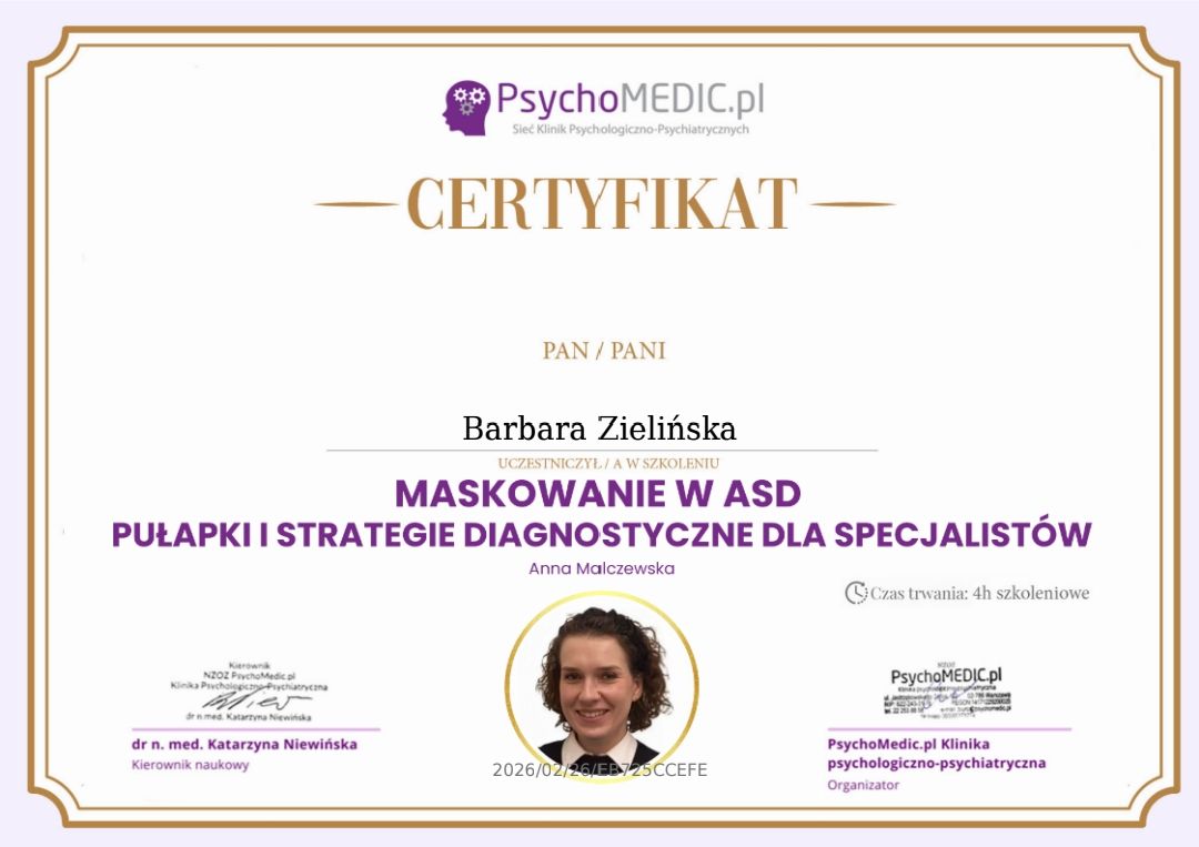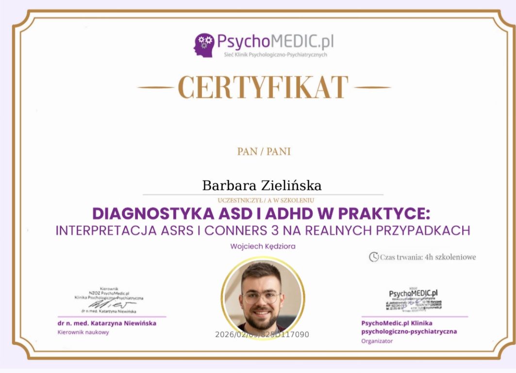 Pomagam zrozumieć diagnozę i odnaleźć w niej przestrzeń do rozwoju - bez szufladkowania i stygmatyzowania. Wspieram w budowaniu praktycznych codziennych strategii, lepszej regulacji emocji oraz odkrywaniu własnych, często nieuświadomionych zasobów.
