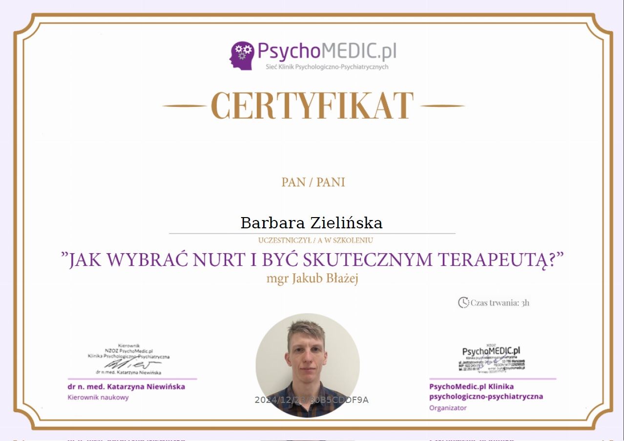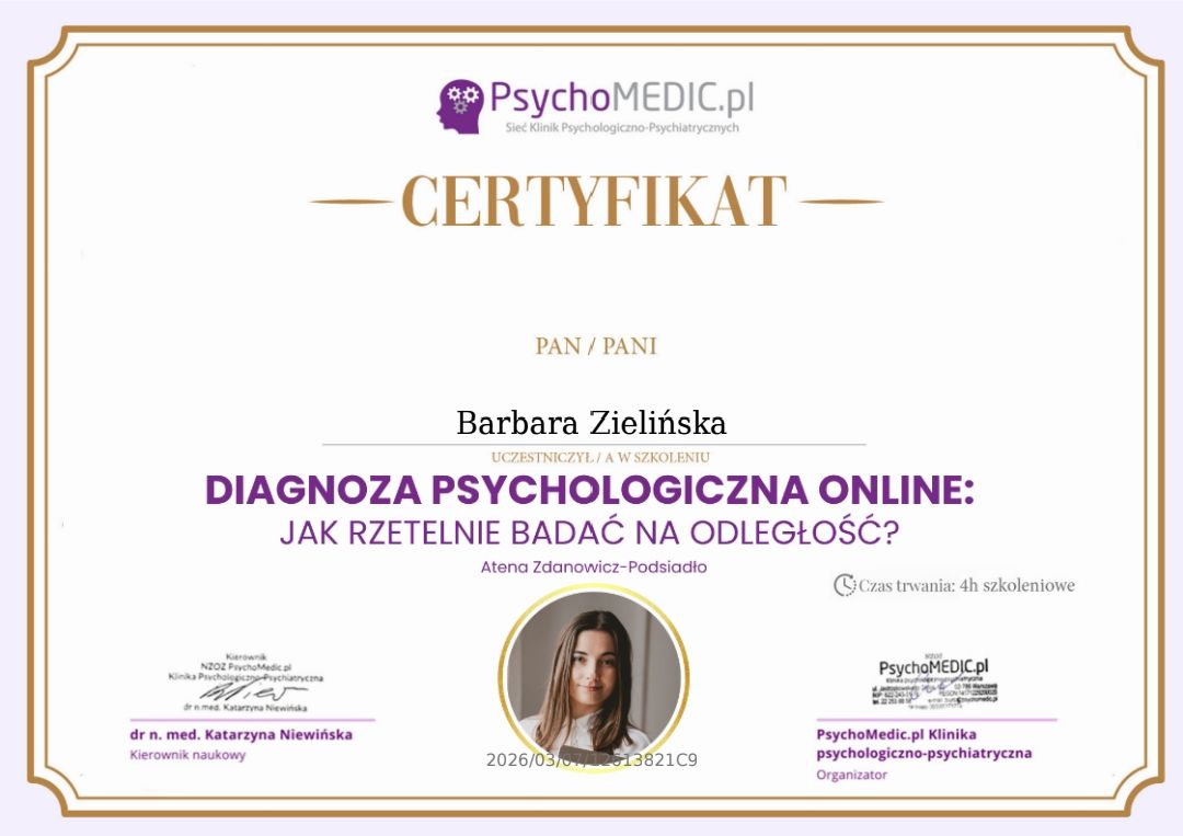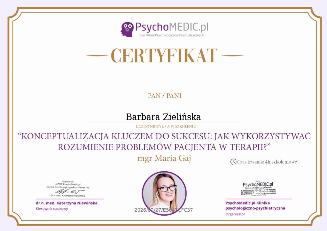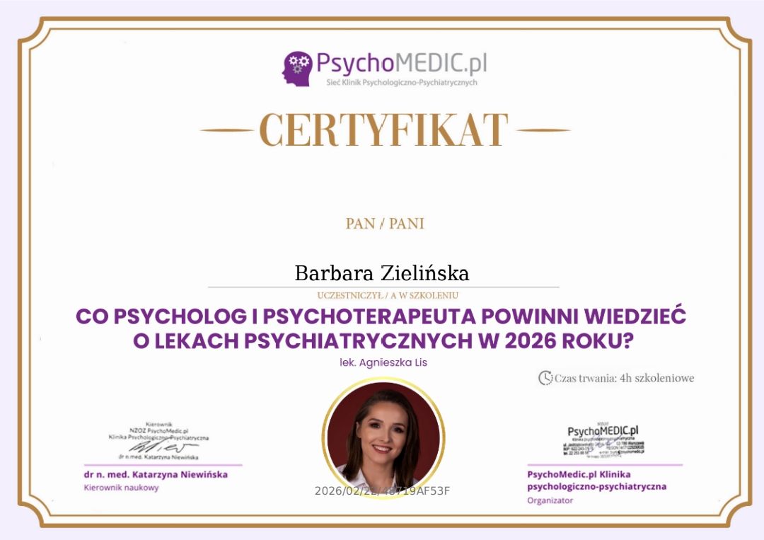 Czy Barbara Zielińska przyjmuje online, bez konieczności pojawiania się w placówce?Tak, Barbara Zielińska oferuje konsultacje online. Wybierz opcję „konsultacja online” przy umawianiu wizyty, a zobaczysz dostępne terminy.