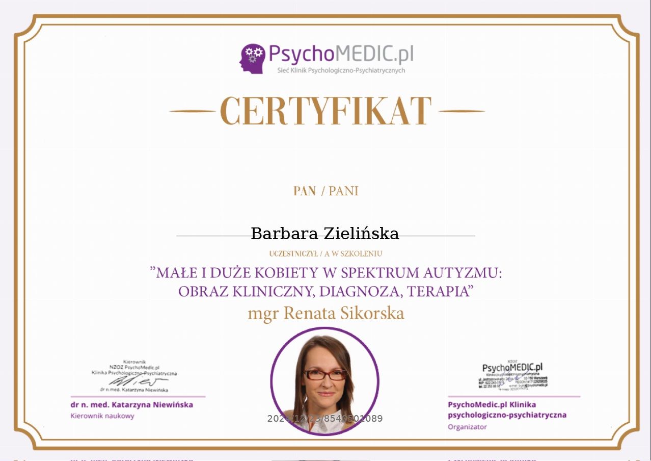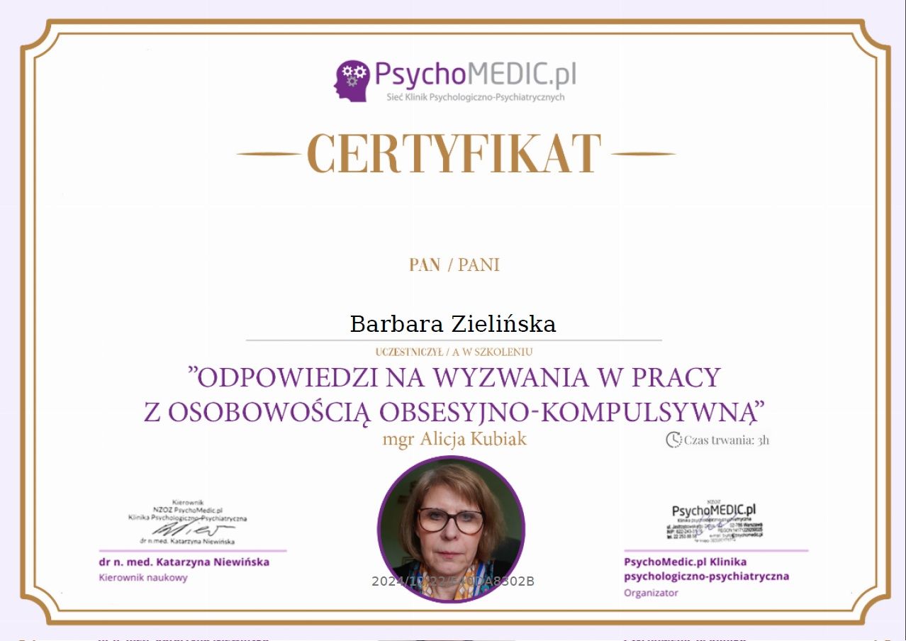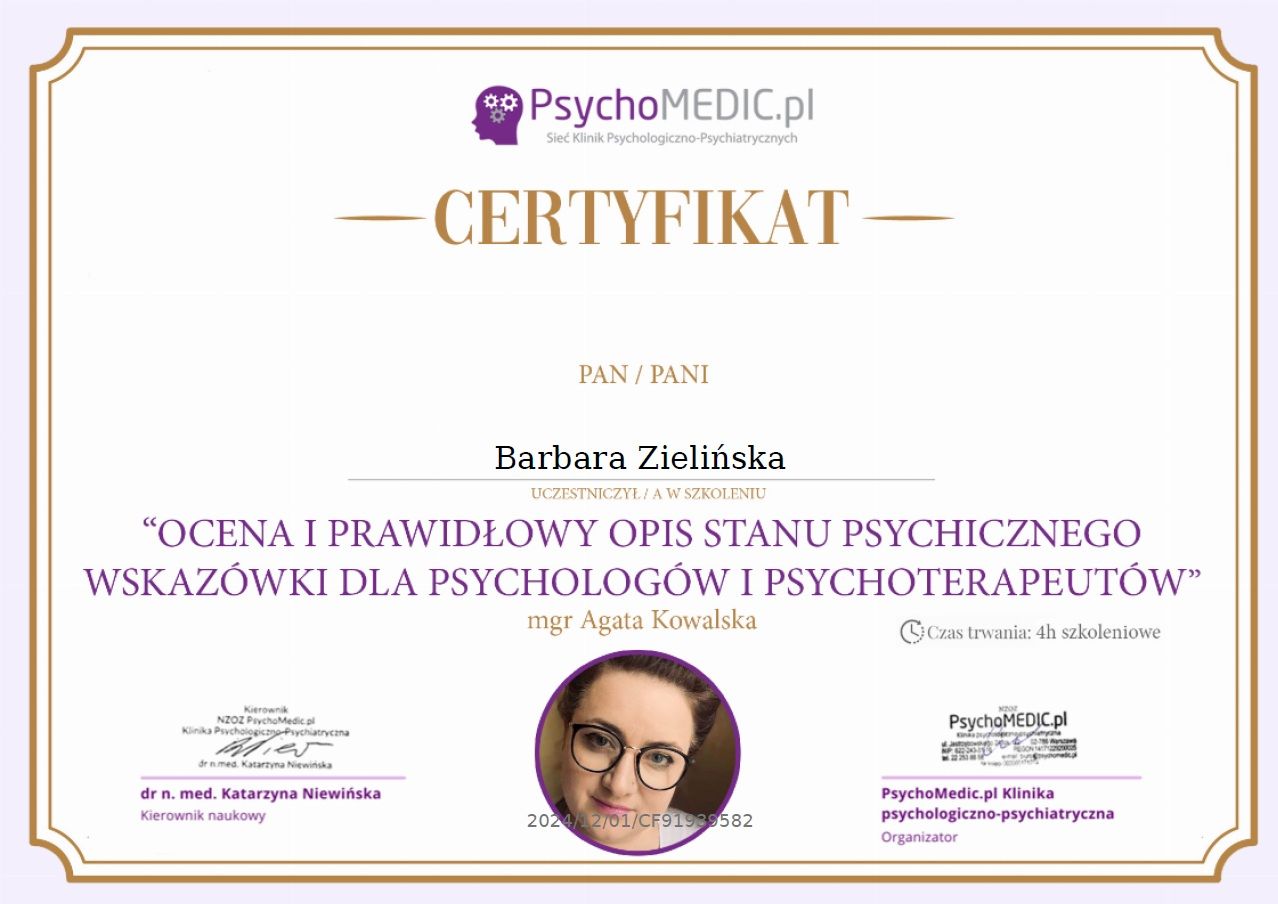 Czy Barbara Zielińska przyjmuje online, bez konieczności pojawiania się w placówce?Tak, Barbara Zielińska oferuje konsultacje online. Wybierz opcję „konsultacja online” przy umawianiu wizyty, a zobaczysz dostępne terminy.