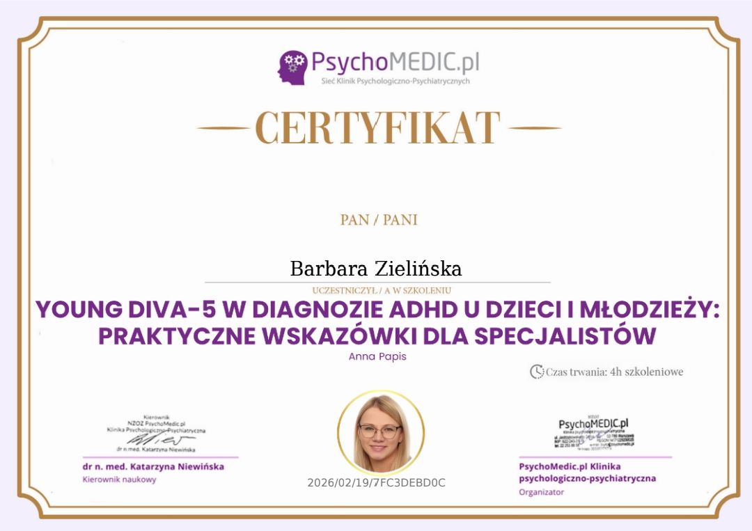 Te narzędzia pomagają mi precyzyjniej zrozumieć Twoje (lub Twojego dziecka) aktualne funkcjonowanie, objawy i potrzeby - wszystko po to, by wsparcie było jak najbardziej dopasowane i skuteczne.