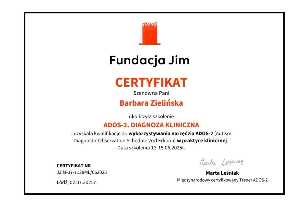 ADOS-2 - złoty standard obserwacyjnej diagnozy spektrum autyzmu (na ten moment badanie wykonuję od 16. roku życia wzwyż),