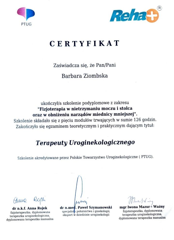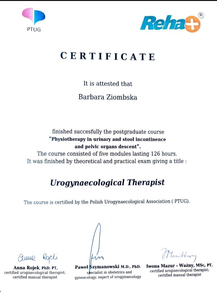 Ukończyłam studia magisterskie na Akademii Wychowania Fizycznego w Warszawie. Po odbyciu szkolenia akredytowanego przez Polskie Towarzystwo Uroginekologiczne (PTUG) otrzymałam tytuł Terapeutki Uroginekologicznej.