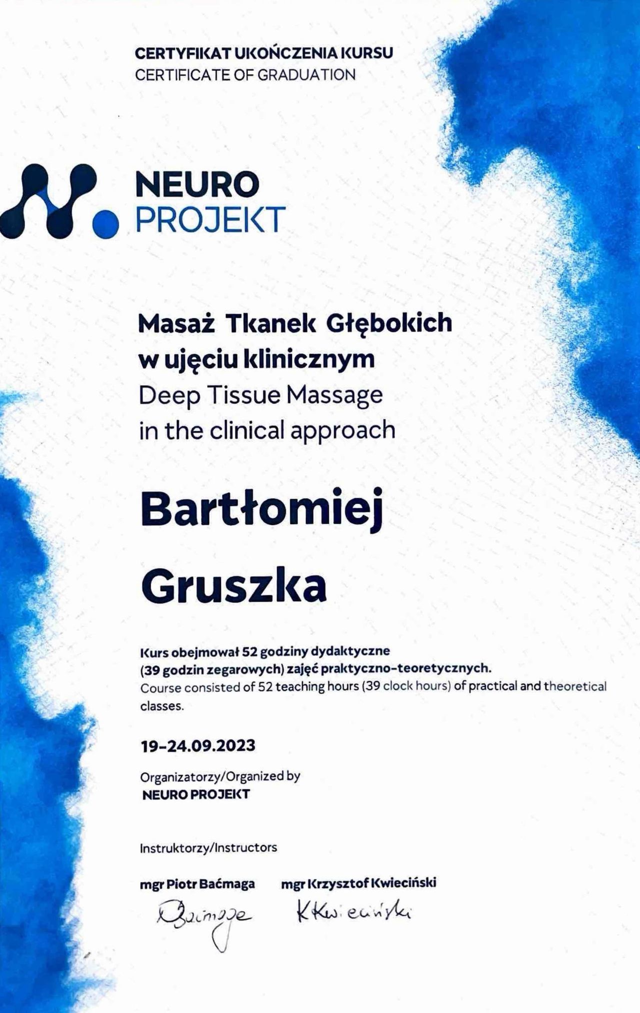 Miałem bardzo silne dolegliwości związane z rwą barkową i trafiłem do Bartka. Już po pierwszej wizycie poczułem ogromną ulgę, a ból praktycznie zniknął następnego dnia. Fachowe podejście, duża wiedza i przyjazna atmosfera sprawiły, że szybko wróciłem do sprawności. Z całego serca polecam!