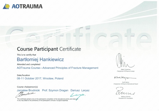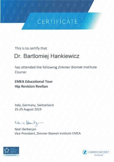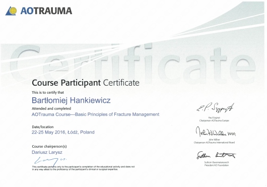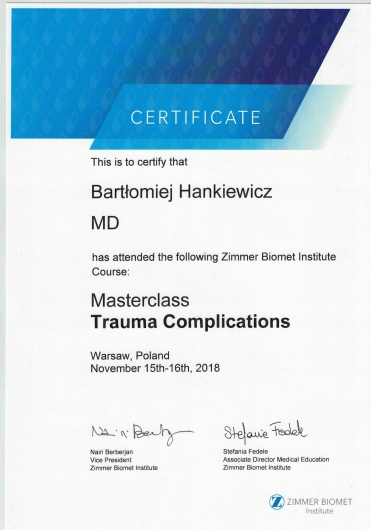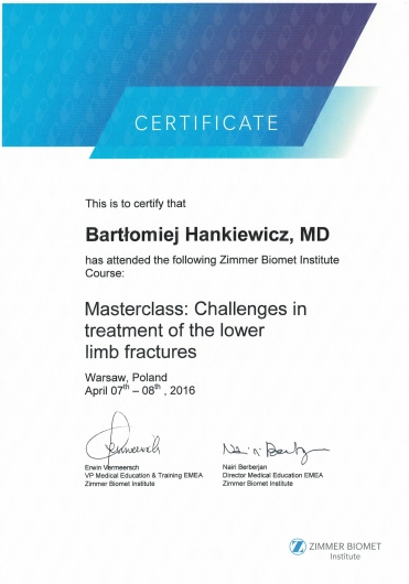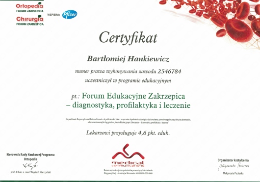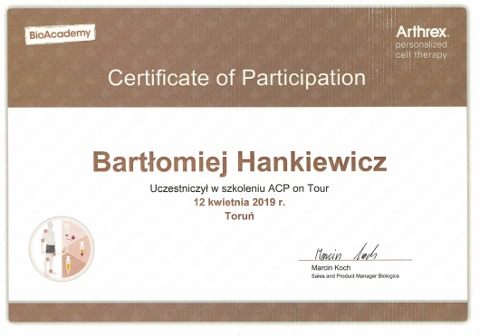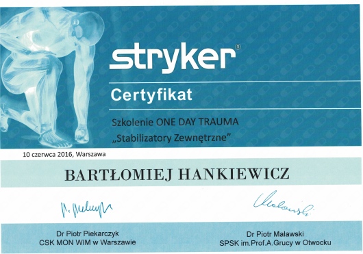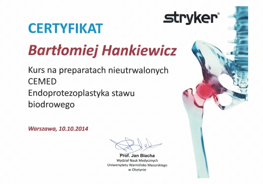 Regularnie uczestniczy konferencjach naukowych i kursach dotyczących nowoczesnych metod diagnostyki i leczenia w ortopedii zarówno w kraju jak i zagranicą.