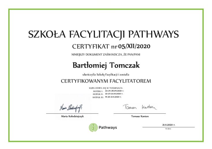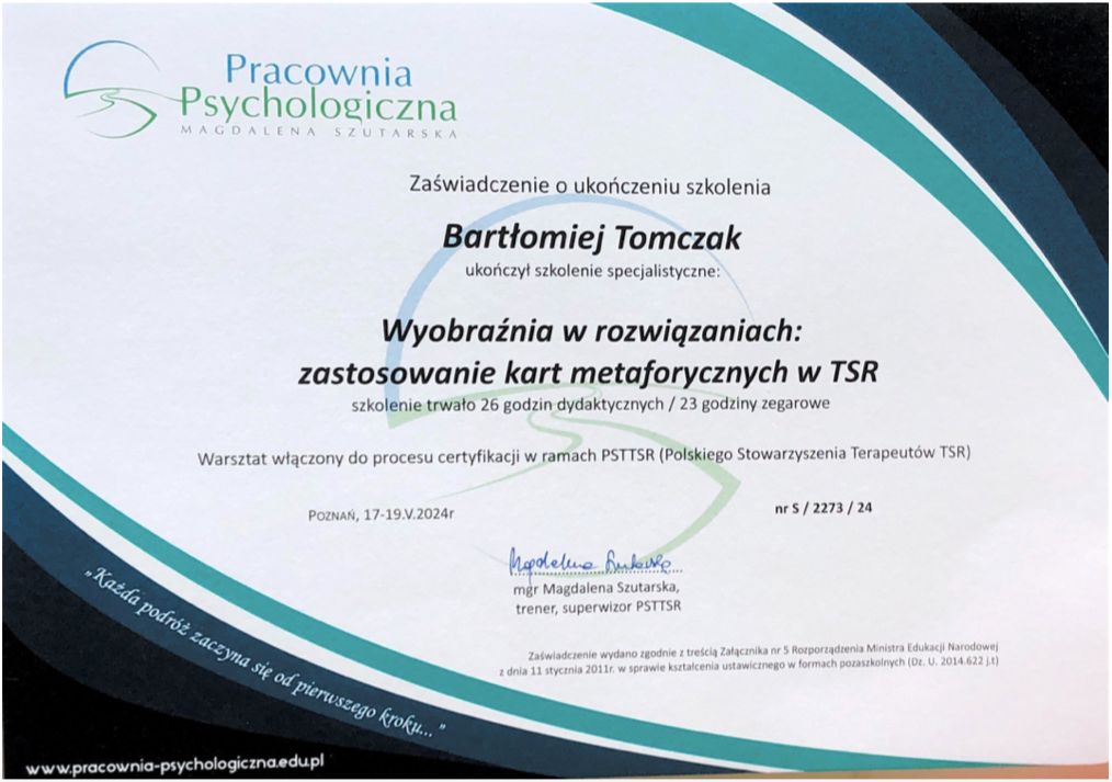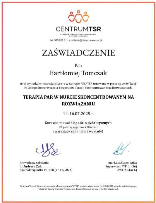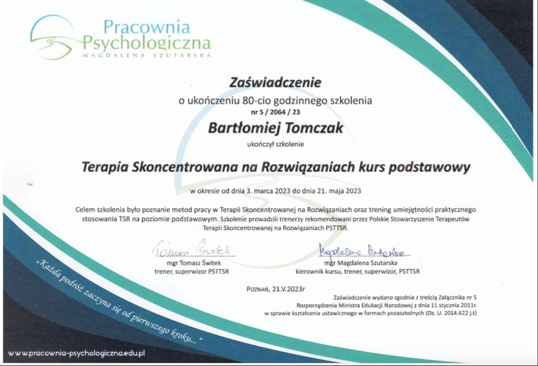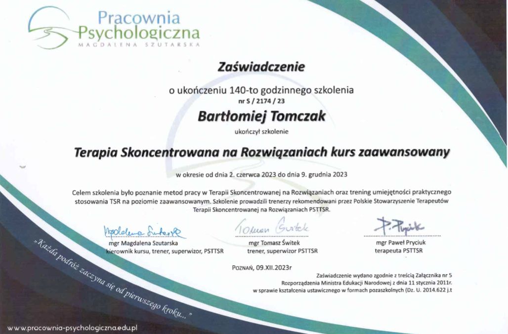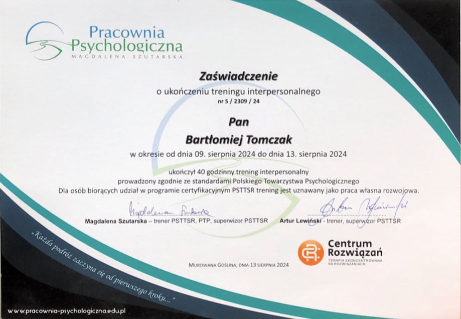 Jestem członkiem Polskiego Stowarzyszenia Terapeutów Terapii Skoncentrowanej na Rozwiązaniach.