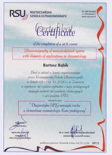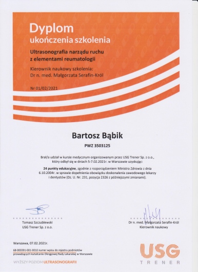 Absolwent Warszawskiego Uniwersytetu Medycznego, a obecnie lekarz specjalista ortopedii i traumatologii narządu ruchu w SPSK im. Grucy w Otwocku. Członek Polskiego Towarzystwa Artroskopowego, Polskiego Towarzystwa Ortopedii i Traumatologii oraz aktywny członek European Society for Sports Traumatology, Knee Surgery and Arthroscopy (ESSKA). Laureat stypendium Polskiego Towarzystwa Artroskopowego - Szkoła Artroskopii "SNACE" w 2021 roku oraz Laureat stypendium Polskiego Towarzystwa Artroskopowego w roku 2022. Ukończyłem liczne kursy USG i wykonuje między innymi badania USG stawu kolanowego, USG stawu łokciowego, USG stawu barkowego, USG stopy, USG nadgarstka i małych stawów, USG stawu biodrowego Stale zwiększam swoje kwalifikacje i nabywam nowe umiejętności poprzez uczestnictwo w licznych kursach i szkoleniach.