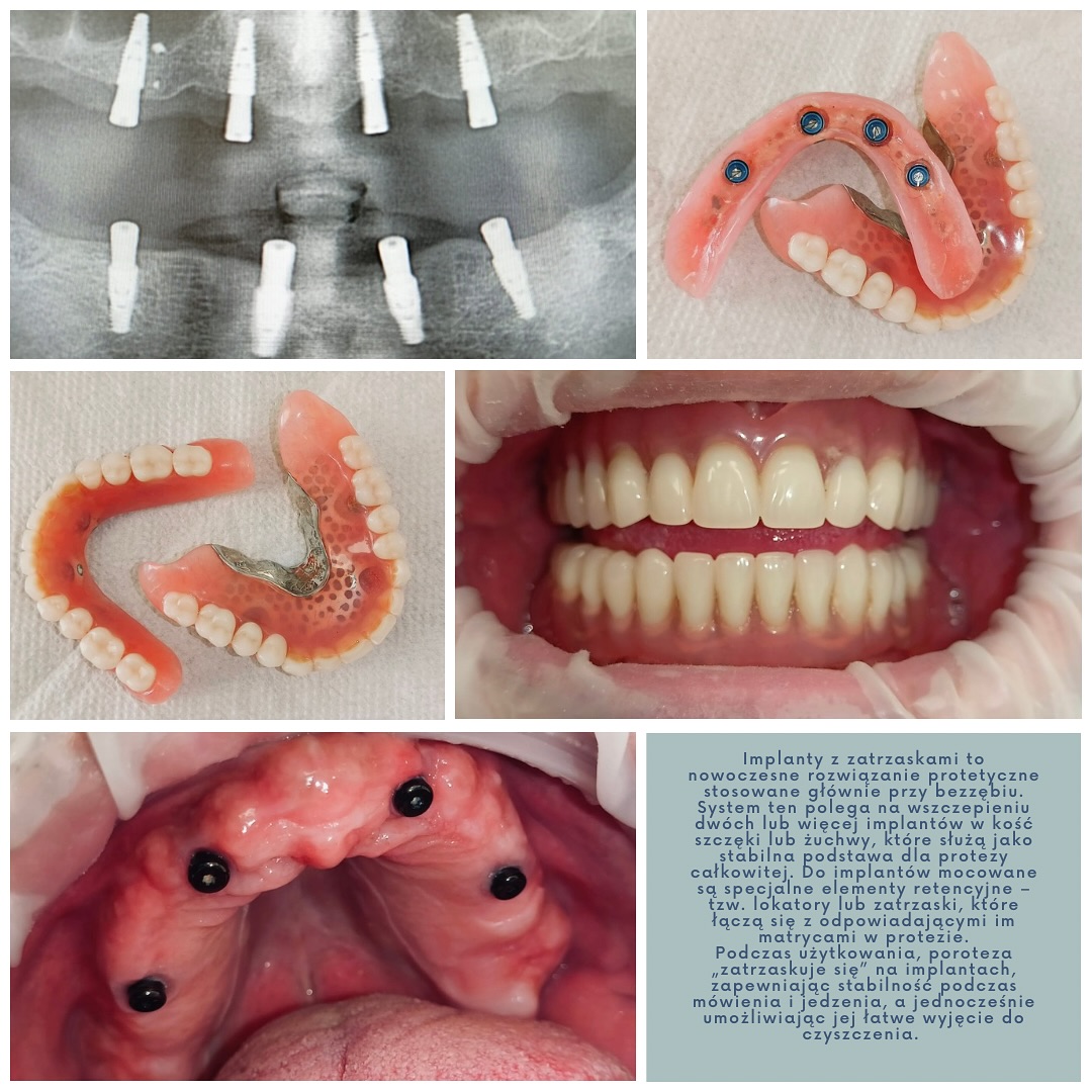 Implanty z zatrzaskami to nowoczesne rozwiązanie protetyczne stosowane głównie przy bezzębiu. System ten polega na wszczepieniu dwóch lub więcej implantów w kość szczęki lub żuchwy, które służą jako stabilna podstawa dla protezy całkowitej. Do implantów mocowane są specjalne elementy retencyjne – tzw. lokatory lub zatrzaski, które łączą się z odpowiadającymi im matrycami w protezie.