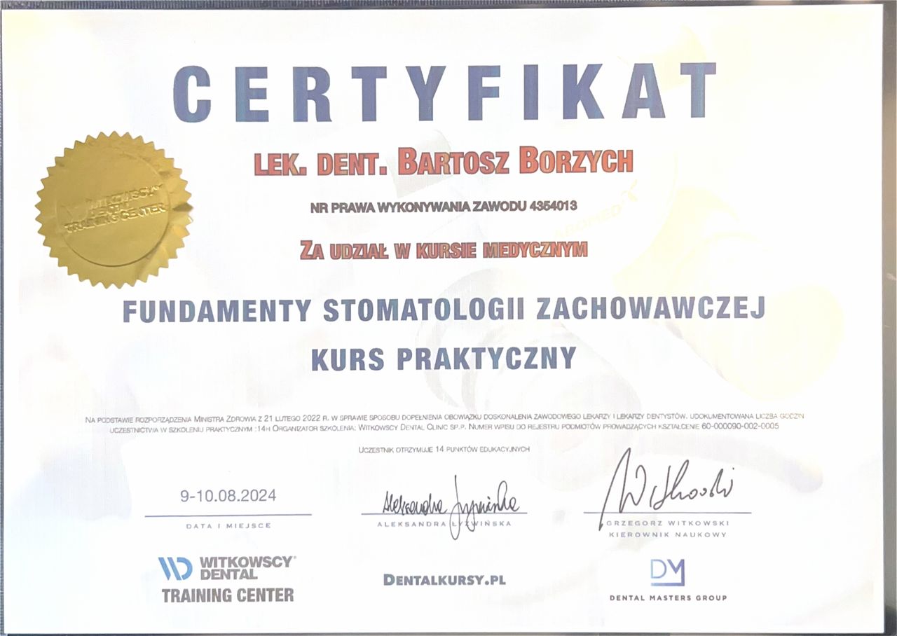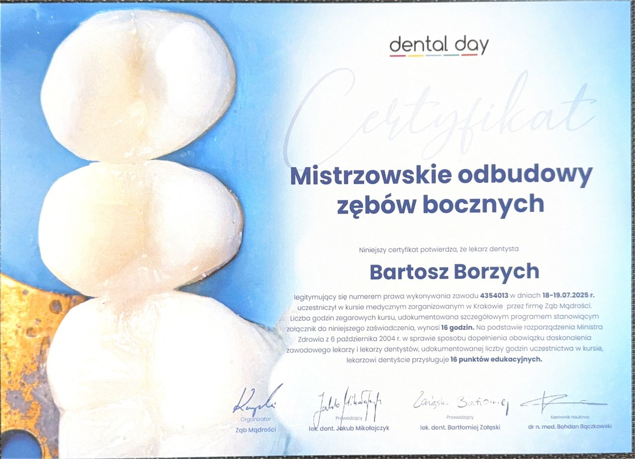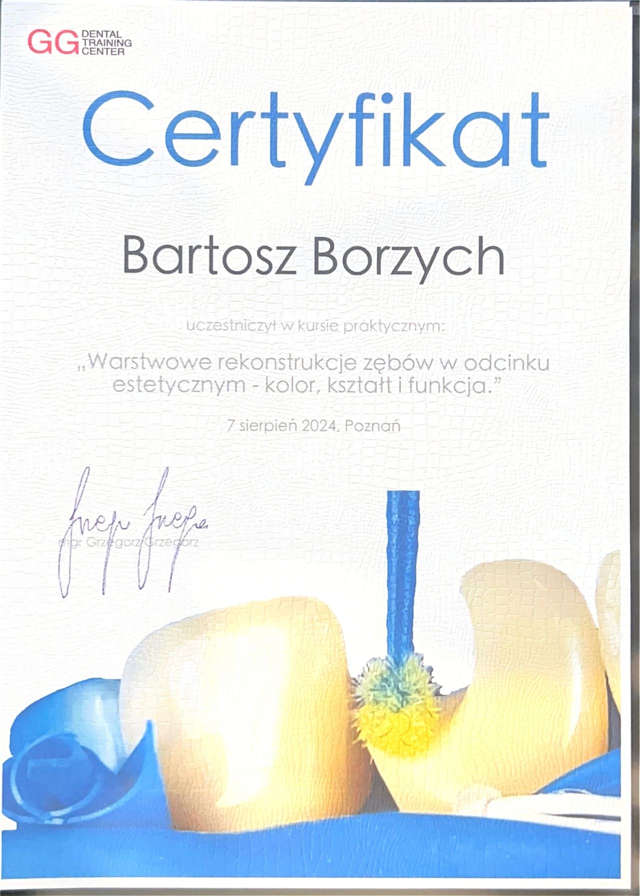 Jaki jest zakres porad oferowanych przez Bartosz Borzych?Bartosz Borzych to stomatolog. Na podstawie swojego doświadczenia i wykształcenia Bartosz Borzych oferuje usługi takie jak: Konsultacja stomatologiczna, konsultacja stomatologiczna (pierwsza wizyta), leczenie próchnicy, Stomatologia zachowawcza, wypełnienie dwóch zębów sąsiednich w jednym znieczuleniu, wypełnienie kompozytowe w zębie stałym, wypełnienie zęba materiałem światłoutwardzalnym.