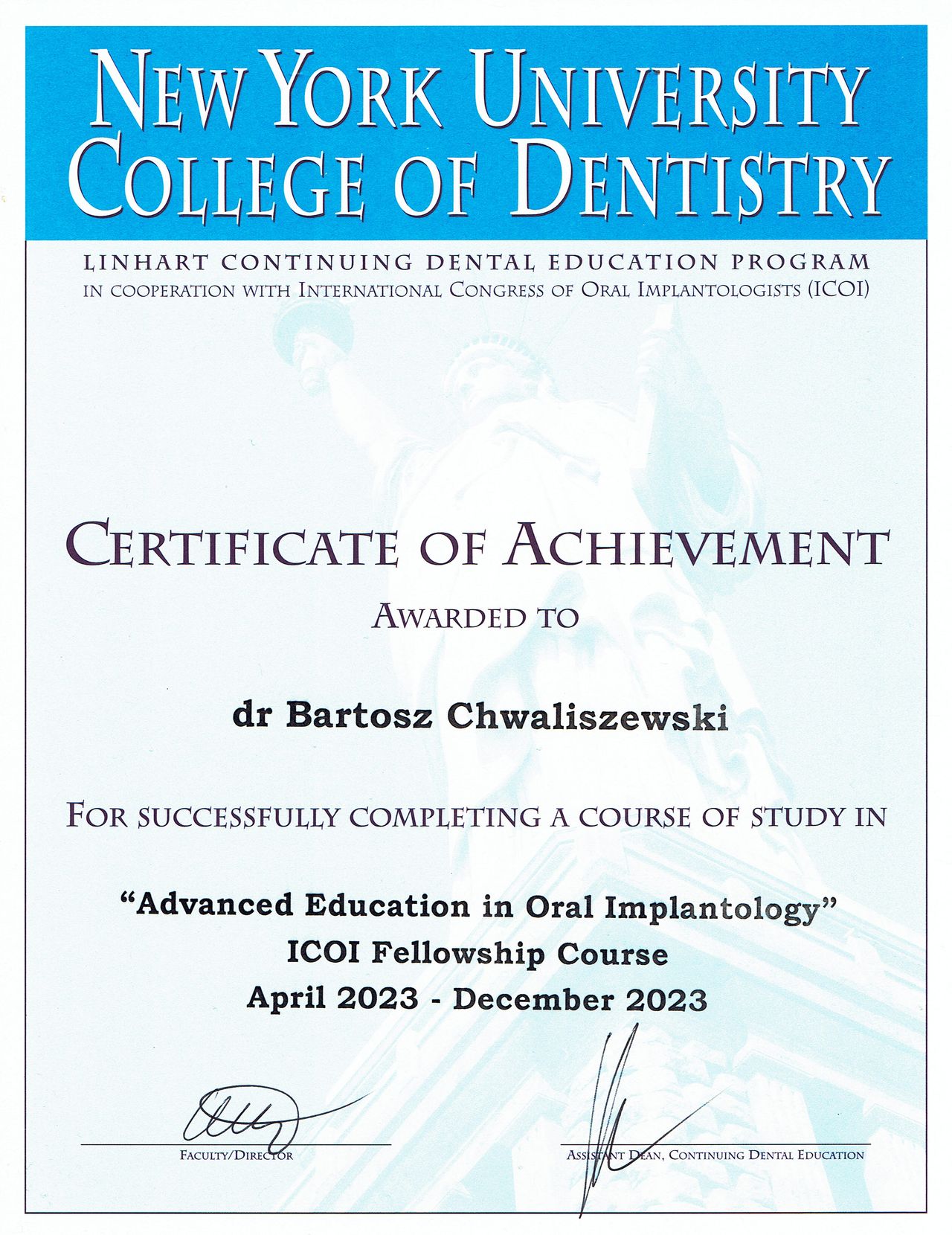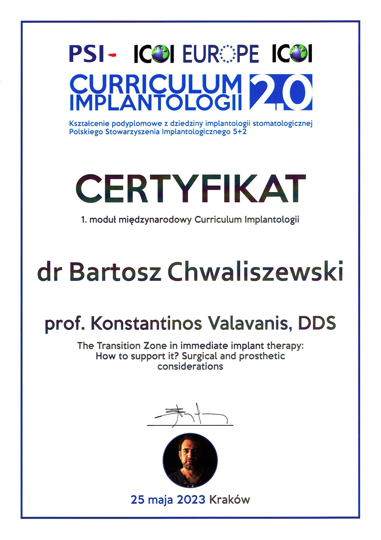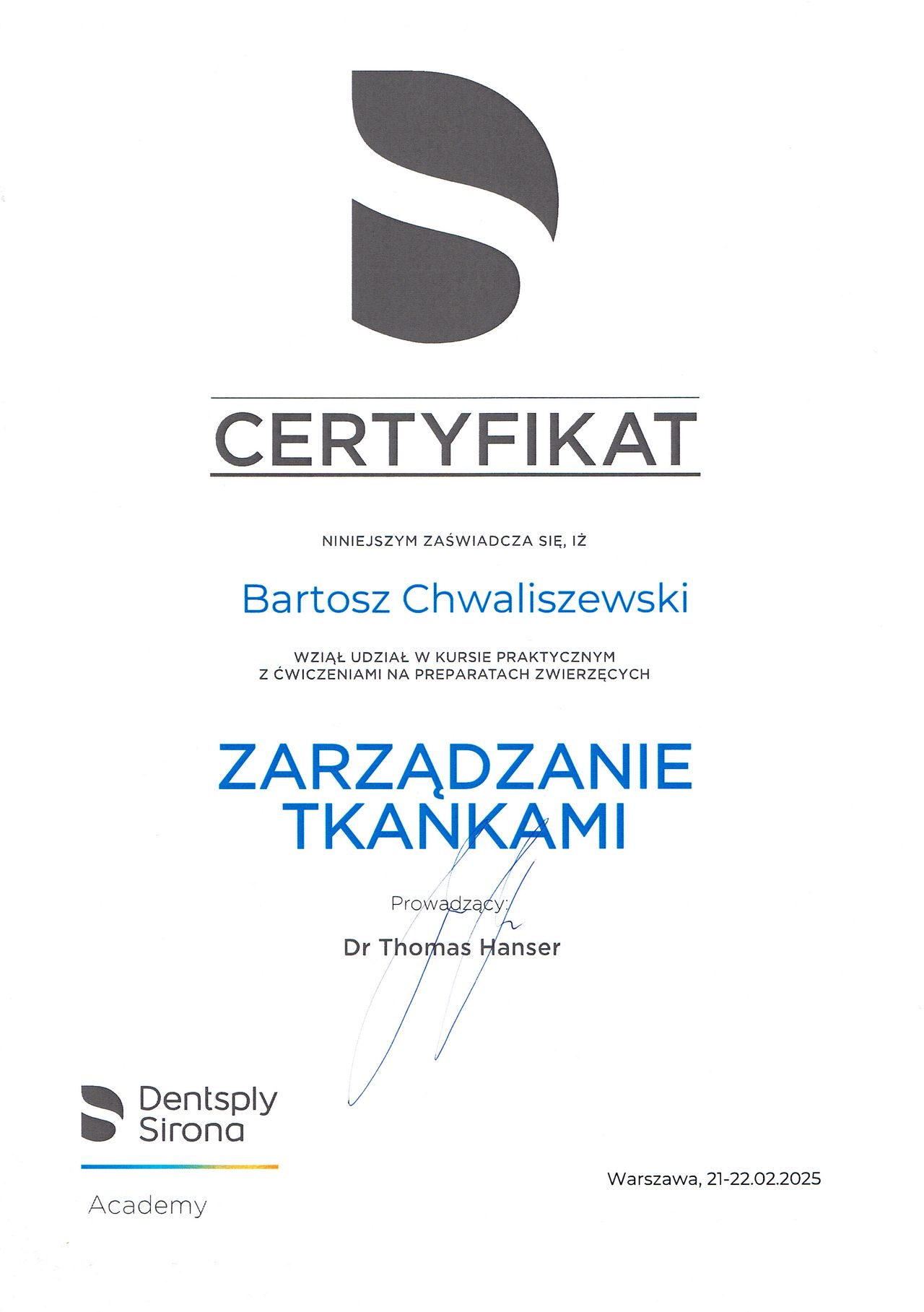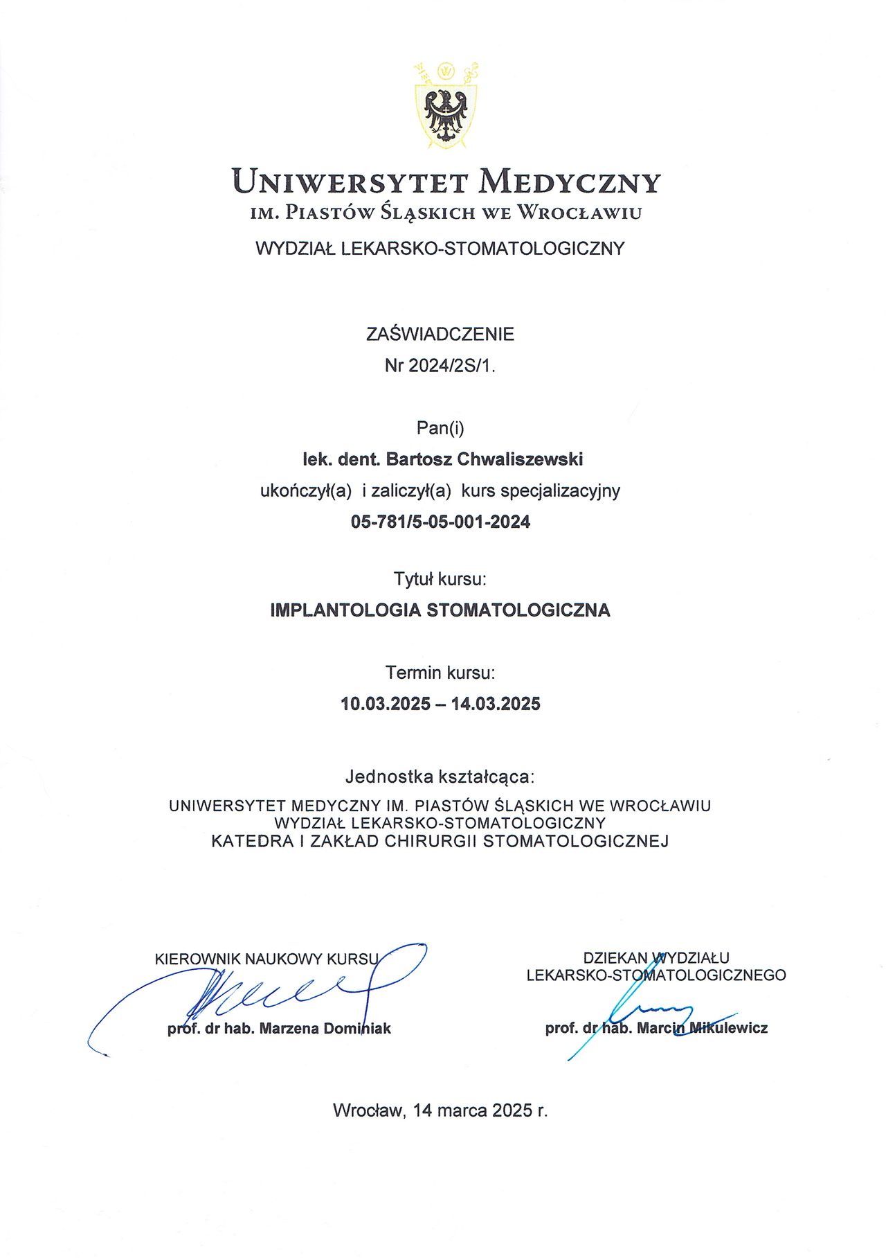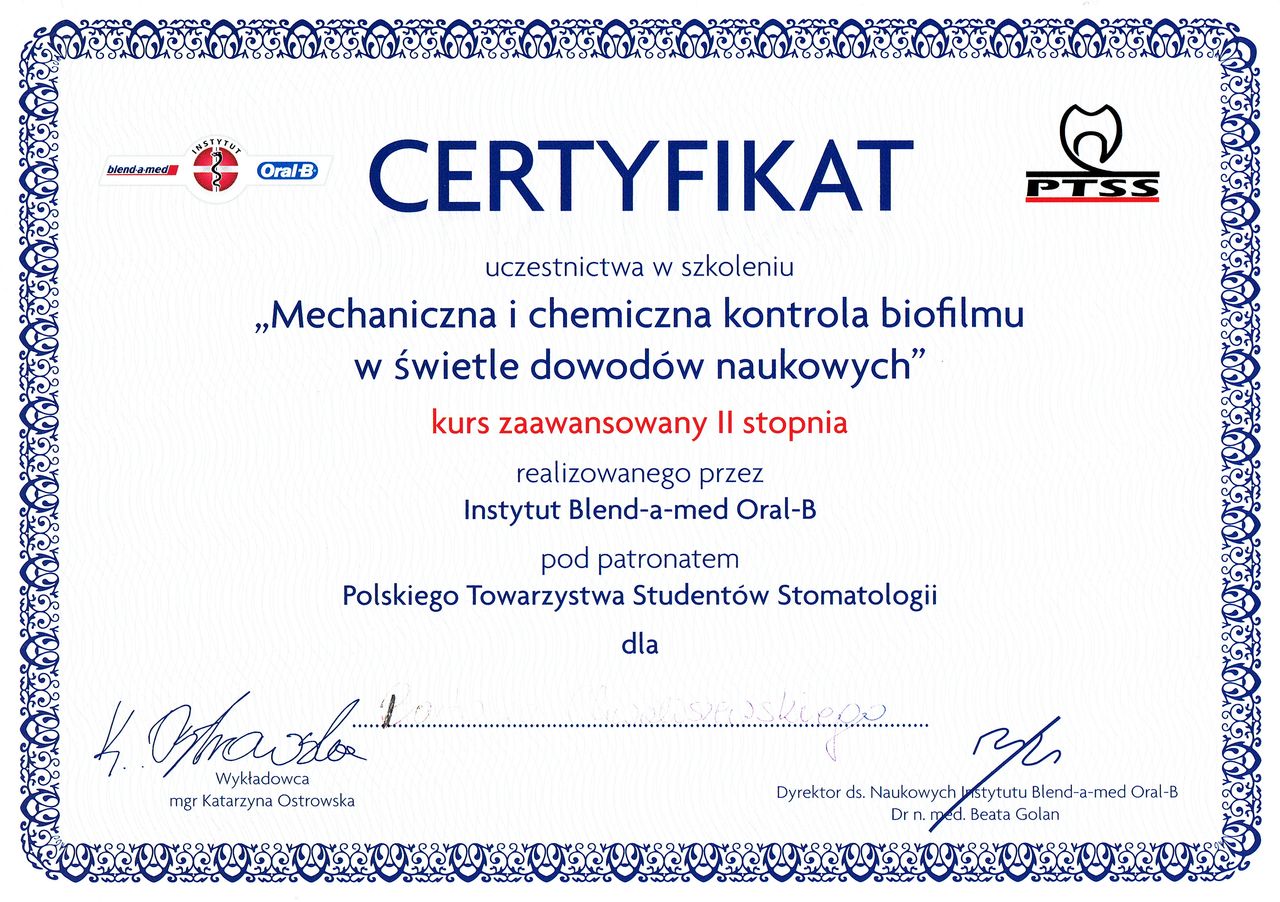 Studia na Wydziale Medycyny i Stomatologii Pomorskiego Uniwersytetu Medycznego w Szczecinie ukończyłem w 2020 roku. Po studiach byłem zawodowo związany ze Szczecinem, gdzie aktywnie nabywałem doświadczenia w pracy klinicznej i szkoliłem się. Obecnie jestem lekarzem rezydentem, w trakcie specjalizacji z chirurgii stomatologicznej. Pracowałem jako etatowy lekarz w Klinice Chirurgii Szczękowo-Twarzowej w USK we Wrocławiu, w chwili obecnej jestem pracownikiem Kliniki Chirurgii Stomatologicznej w UCS we Wrocławiu, gdzie między innymi realizuję się w działalności naukowej – jestem autorem prac naukowych w dziedzinach implantologii oraz materiałoznastwa, opublikowanych m. im. w czasopiśmie MDPI Materials. W 2025 roku zdałem Państwowy Egzamin Specjalizacyjny z chirurgii stomatologicznej. Aktywnie uczestniczę w licznych kursach i międzynarodowych sympozjach, w tym w dziedzinach chirurgii stomatologicznej, implantologii oraz protetyki stomatologicznej, gdzie wciąż poszerzam swoją wiedzę i umiejętności, a także należę do międzynarodowych stowarzyszeń implantologicznych ICOI oraz ICOI Europe i Polskiego Stowarzyszenia Implantologicznego. Jestem także absolwentem Curriculum Implantologicznego 2.0 pod patronatem PSI (2023 rok) oraz szkolenia Advanced Education in Oral Implantology – ICOI Fellowship Course, prowadzonego pod auspicjami New York University College of Dentistry, w kooperacji z ICOI (2023 rok). Moimi głownymi obszarami pracy klinicznej są chirurgia stomatologiczna, implantologia i implantoprotetyka. Leczenie u każdego Pacjenta planuję indywidualnie, z wykorzystaniem zaawansowanych protokołów cyfrowych, pozwalających mi uzyskiwać satsfakcjonujące, przewidywalne rezultaty.