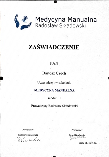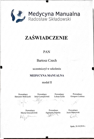 Pana Bartosz ma wiedzę na temat całego ciała. Jest specjalistą wśród osób ćwiczących akrojogę. Podczas wizyty pracuje równolegle z różnymi kontuzjami. Wprowadza luźną atmosferę i odpowiada na wszystkie pytania i wątpliwości.