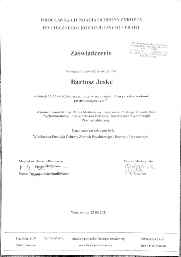[PL; ENG below] Jestem psychologiem, psychoterapeutą w trakcie szkolenia oraz założycielem Fundacji Rozwoju Psychoedukacji i Psychoterapii "Bartki". Pragnę się z Tobą podzielić moją pasją do psychoterapii oraz doświadczeniem, które zdobyłem podczas wieloletniej pracy z ludźmi. Posiadam tytuł magistra psychologii i obecnie jestem w trakcie realizowania czteroletniego Całościowego Kursu Psychoterapii organizowanego przez Wrocławską Fundację Zdrowia Psychicznego i Rozwoju Psychoterapii (PTP). Jestem członkiem Polskiego Stowarzyszenia Terapeutów Terapii Skoncentrowanej na Rozwiązaniach (PST TSR) oraz Polskiego Towarzystwa Psychiatrycznego (PTP) gdzie superwizuję swoją pracę. Swoje umiejętności rozwijam zarówno w pracy gabinetowej jak i podczas licznych szkoleń i kursów. Doświadczenie jako psycholog zdobywałem w PZP "Subsidio" w Dierżoniowie oraz podczas stażu w Centrum Neuropsychiatrii Dziecięcej "Neuromed". Moje podejście do psychoterapii jest oparte na duchu postmodernistycznym, gdzie Twoje unikalne doświadczenia, perspektywy kulturowe i społeczne są kluczowe. Wspólnie badamy Twoje potrzeby, by odkryć różnorodność ich znaczeń i sposobów, w jakie wpływają na Twoje życie. Zapraszam Cię do mojego gabinetu, gdzie wspólnie odkryjemy nowe znaczenia twoich doświadczeń i tego, w jaki sposób możemy z nich korzystać na drodze do pełniejszego życia. To Twoje doświadczenia i Twoja wiedza są naszym drogowskazem. Jako terapeuta, jestem tutaj, aby Ci towarzyszyć w poszukiwaniu Twojej ścieżki rozwoju i większej harmonii wewnętrznej. Skontaktuj się ze mną, a razem stworzymy wyjątkową podróż ku pozytywnym zmianom. ----------------------- I am a psychologist, psychotherapist in training and founder of the Foundation for the Development of Psychoeducation and Psychotherapy "Bartki". I would like to share with you my passion for psychotherapy and the experience I have gained during many years of working with people. I hold a master's degree in psychology and am currently pursuing a four-year Comprehensive Psychotherapy Training Course organized by the Wrocław Foundation for Mental Health and Psychotherapy Development (PTP). I am a member of the Polish Association of Therapists in Solution-Focused Therapy (PST TSR) and the Polish Psychiatric Association (PTP) where I supervise my work. I continue developing my skills in private practice and through various workshops and courses. I gained experience working as a psychologist at PZP "Subsidio" in Dierżoniów and during an internship at the Neuropsychiatric Center for Children "Neuromed." My approach to psychotherapy is rooted in a postmodernist spirit, where your unique experiences, cultural perspectives, and social context are paramount. Together, we explore your needs to uncover the diversity of their meanings and how they impact your life. I invite you to my office, where we will discover new meanings of your experiences and how you can utilize them on the way to a fulfilling life. It is your experiences and your knowledge that guide us. As a therapist, I am here to accompany you in your search for the path you would own and greater inner harmony. Contact me and together we will create a unique journey towards positive change.