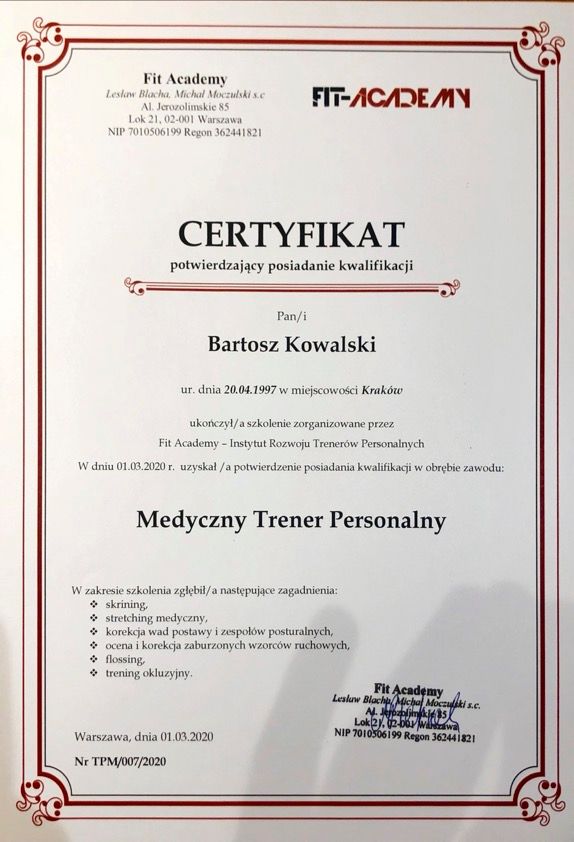 Jaki jest zakres porad oferowanych przez Bartosz Kowalski?Bartosz Kowalski to fizjoterapeuta. Na podstawie swojego doświadczenia i wykształcenia Bartosz Kowalski oferuje usługi takie jak: konsultacja fizjoterapeutyczna, Trening personalny, medyczny trening rehabilitacyjny, fizjoterapia, Medyczny trening terapeutyczny, trening funkcjonalny, Trening medyczny.