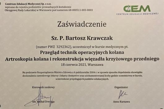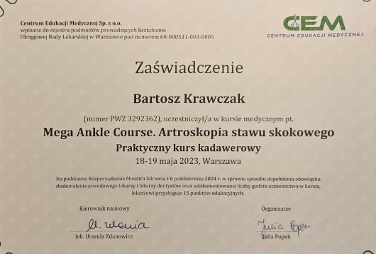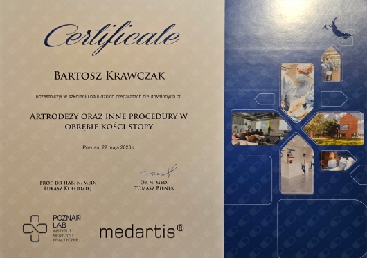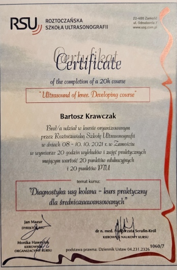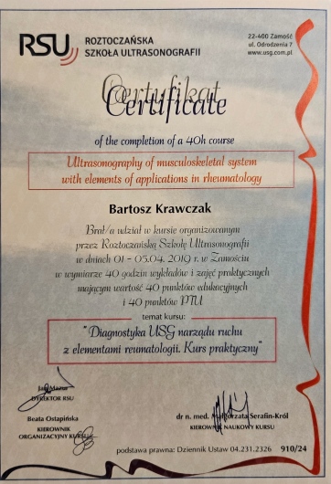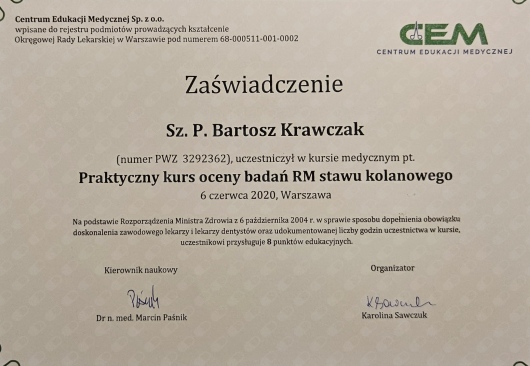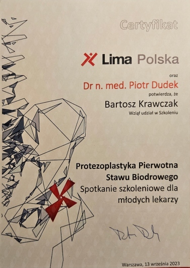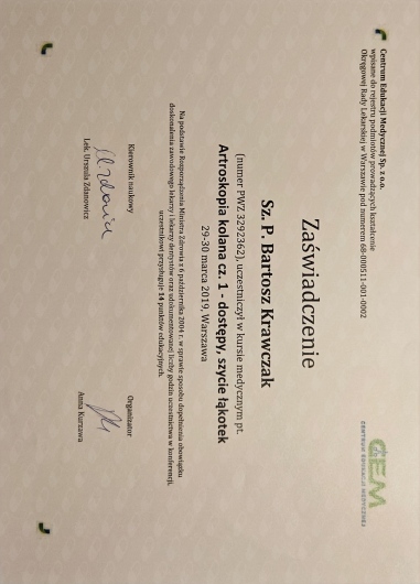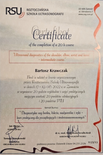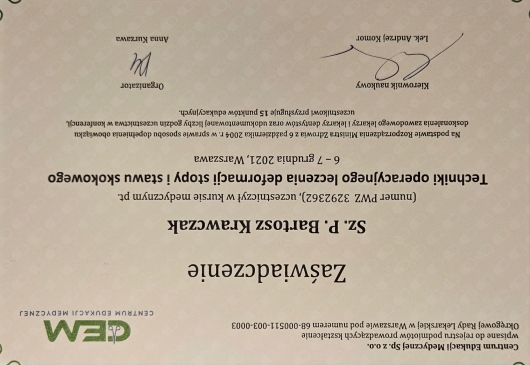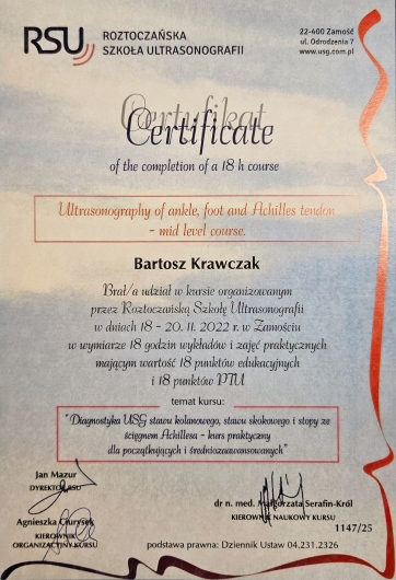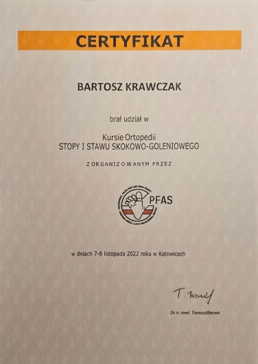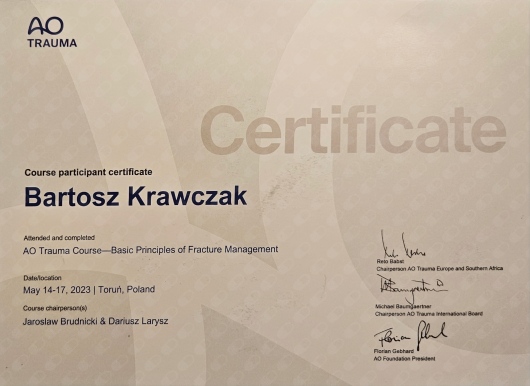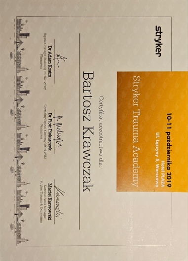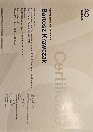 Szkolenie specjalizacyjne odbywałem na oddziale Ortopedii i Traumatlologii Narządu Ruchu Szpitala Miejskiego w Rzeszowie, gdzie obecnie pracuję jako starszy Asystent.