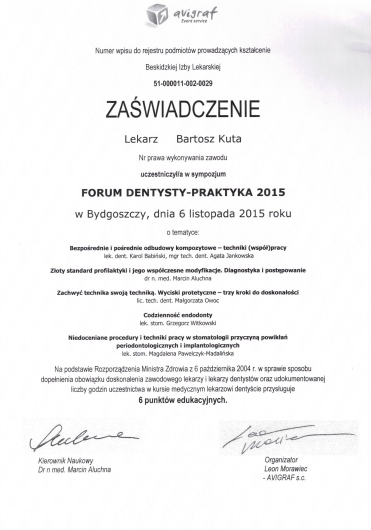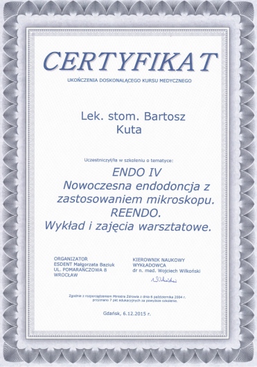 Jaki jest zakres porad oferowanych przez Bartosz Kuta?Bartosz Kuta to stomatolog. Na podstawie swojego doświadczenia i wykształcenia Bartosz Kuta oferuje usługi takie jak: Konsultacja stomatologiczna, konsultacja endodontyczna, wizyta bólowa (zaopatrzenie pacjenta), stomatologia dziecięca, pakiet higienizacyjny, konsultacja protetyczna, konsultacja implantologiczna.