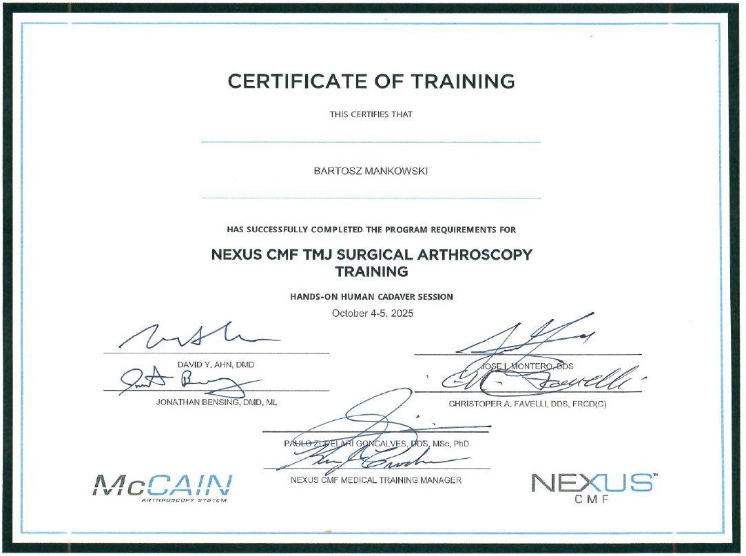 Lekarz, doktor nauk medycznych, specjalista chirurgii szczękowo-twarzowej, chirurgii ogólnej oraz przyszły specjalista z zakresu ortopedii i traumatologii narządu ruchu. W pracy zawodowej koncentrujący się na łączeniu zaawansowanej chirurgii szczękowo-twarzowej z ortopedią i traumatologią narządu ruchu. W pracy klinicznej szczególny nacisk kładzie na nowoczesne, małoinwazyjne metody leczenia stawów skroniowo-żuchwowych oraz mikrochirurgię rekonstrukcyjną. Na co dzień uczy się oraz dzieli się swoją wiedzą, jako wykładowca na kursach specjalistycznych w Polsce i Europie.