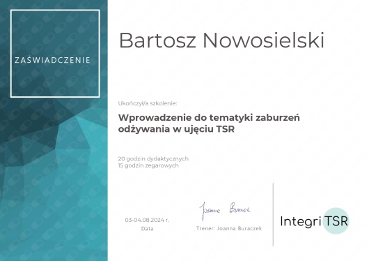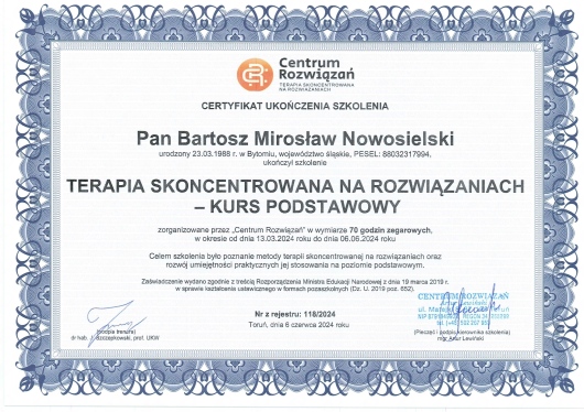 Jestem absolwentem psychologii o specjalizacji biznes i organizacje na Uniwersytecie SWPS w Katowicach. Jestem słuchaczem studiów podyplomowych na kierunku Psychodietetyka na Uniwersytecie SWPS. Pracuję klinicznie w Centrum Zdrowia Psychicznego Feniks w Katowicach w Poradni Zdrowia Psychicznego, Zespole Leczenia Środowiskowego oraz jako terapeuta środowiskowy. Doświadczenie zdobywałem odbywając staże na dziennych oddziałach psychiatrycznych zaburzeń psychotycznych w Centrum Zdrowia Psychicznego Feniks w Katowicach, Miejskich Ośrodkach Wychowawczych w Krupskim Młynie i Herbach. Realizowałem procesy tutoringowe dla młodzieży dla Camusu Bemke / Fundacji TDJ. Jestem członkiem Polskiego Towarzystwa Psychiatrycznego, Polskiego Stowarzyszenia Terapeutów Terapii Skoncentrowanej na Rozwiązaniach, Polskiego Towarzystwa Psychoterapeutycznego oraz Polskiego Towarzystwa Leczenia Otyłości. Moja praca jest poddawana regularnej superwizji.
