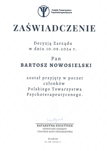 Szczególnie cenię u Pana Bartosza umiejętność uważnego słuchania i wspierania w odkrywaniu tego, co naprawdę się przeżywa. Jego wskazówki i rekomendacje są zawsze trafne i pomocne, a sposób prowadzenia spotkań daje poczucie bezpieczeństwa i zrozumienia.