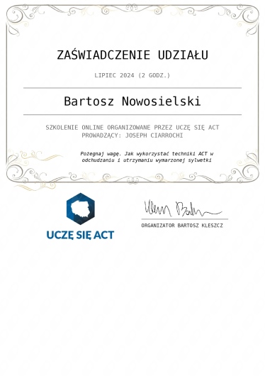 Regularnie spotykam się z Panem Bartoszem online i z całego serca zachęcam każdego, kto się waha, aby umówił się na pierwsze spotkanie. Sesje są prowadzone w sposób bardzo przemyślany – pozwalają nie tylko lepiej poznać siebie, ale też skłaniają do głębokiej refleksji i motywują do samodzielnej pracy nad sobą.