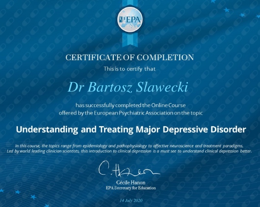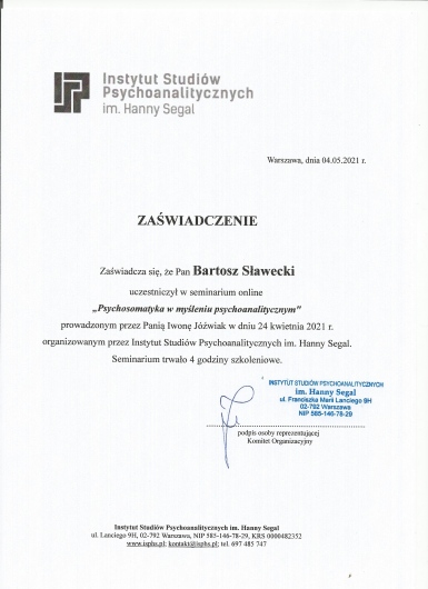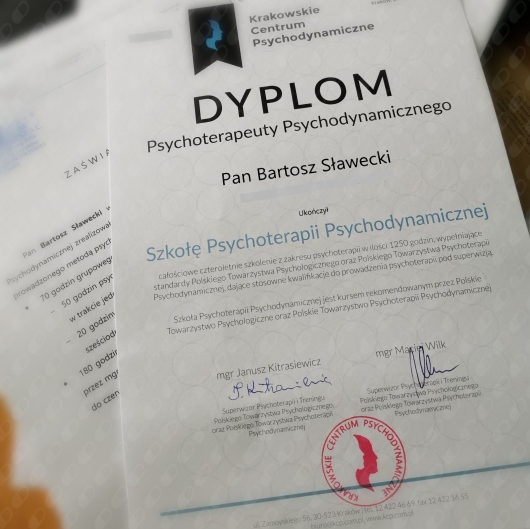 Ukończyłem całościowe, czteroletnie szkolenie w Krakowskim Centrum Psychodynamicznym.