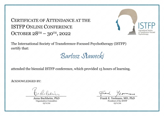 Aktualnie kształcę się w kierunku zostania superwizorem i nauczycielem TFP, co oznacza, że stale rozwijam kompetencje, poddaję swoją pracę superwizji i uczestniczę w środowisku terapeutycznym na poziomie krajowym i międzynarodowym.