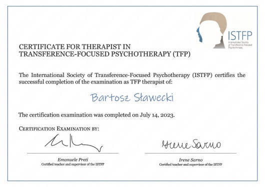 Jestem certyfikowanym terapeutą psychoterapii skoncentrowanej na przeniesieniu (Transference-Focused Psychotherapy, TFP) — to podejście stworzone specjalnie do pracy z zaburzeniami osobowości, trudnościami w ustaleniu stabilnej tożsamości i relacji z innymi.